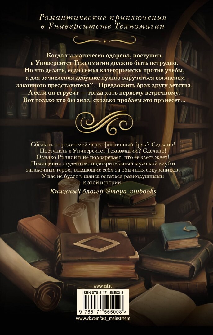 Когда ты магически одарена, поступить в Университет Техномагии должно быть нетрудно. Но что делать, если семья категорически против учебы, а для зачисления девушке нужно заручиться согласием законного представителя?.. Предложить брак другу детства. А если он струсит — тогда хоть первому встречному. Вот только кто бы знал, сколько проблем это принесет...