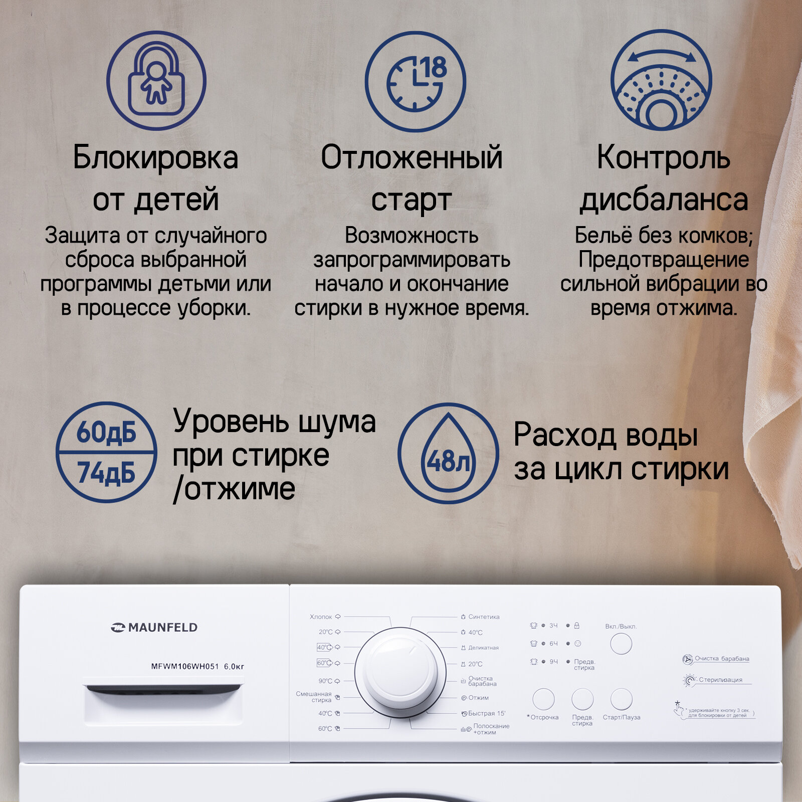 | Дополнительные особенности | блокировка от случайного нажатия, контроль дисбаланса, таймер отсрочки запуска, самодиагностика, пауза, предварительная стирка |