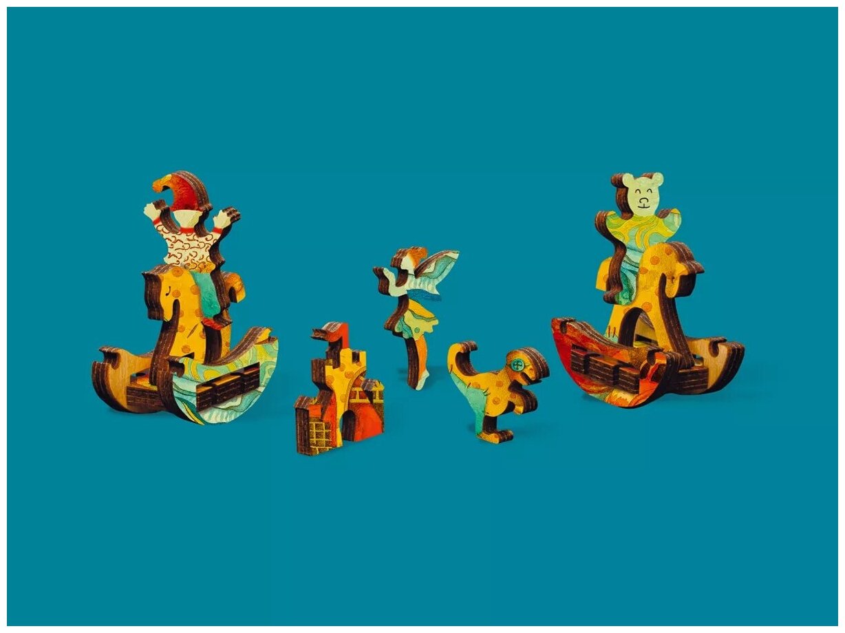 Очаровательная лошадка, выходит за пределы картины, превращаясь в милую игрушку-качалку.Лошадка трансформируется и выходит за пределы картины в виде игрушки-качалки. Стоит собрать две лошадки из пяти элементов каждая и посадить на них мишку и клоуна - и игра обретает другие формы. Вместе с тем в наборе присутствует скрытая загадка Pazzle-in-puzzle в виде лошадки-домика.