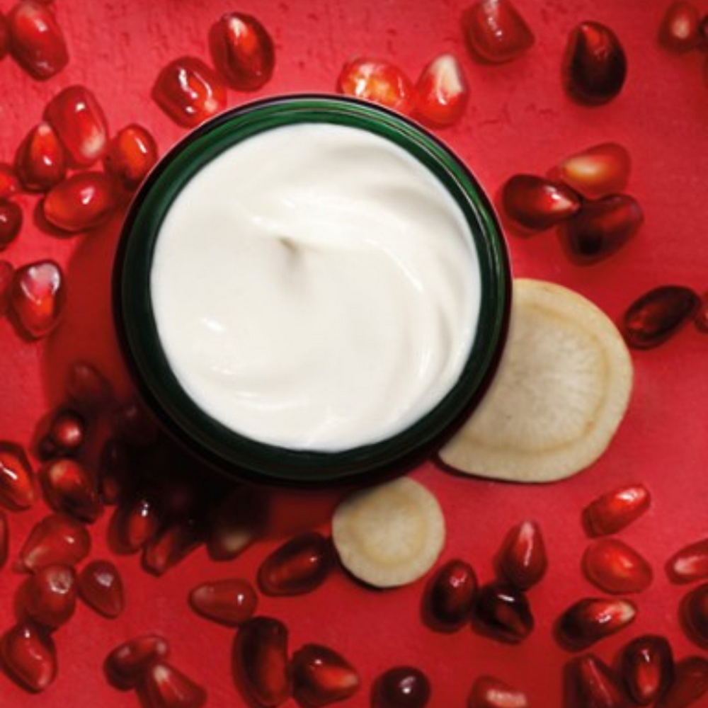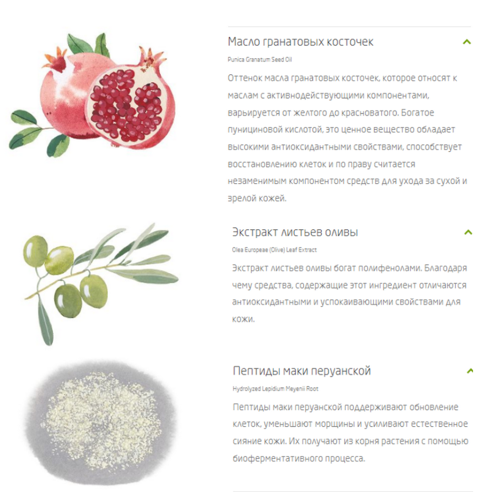 | Состав | вода, кунжутное масло, глицерин, масло карите, пентиленгликоль, цетеариловый спирт, цетеарил глюкозид, этанол, гекторит, масло семян граната, масло макадамии, карнаубский воск, экстракт семян проса, экстракт листьев оливы, масло семян подсолнечника, бетаин, ксантан, лимонная кислота, токоферол, пептиды корня маки, цетеариловый оливат, глицерил каприлат, сорбитан оливковый, стеароил глумат натрия, мальтодекстрин, аромат* |