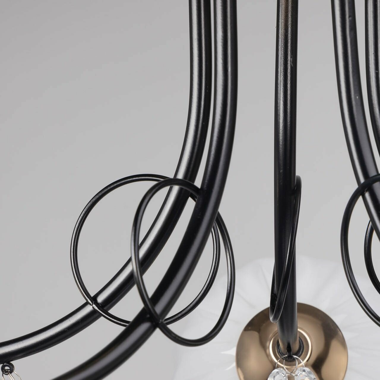 Заменяемые источники света удобны в эксплуатации. Металлическое основание потолочной люстры гальванизировано в цвет золота. Рожки окрашены в черный цвет. Белые стеклянные плафоны выдуваются в сложную форму. Потолочная люстра декорирована прозрачным хрусталем формы октагон.