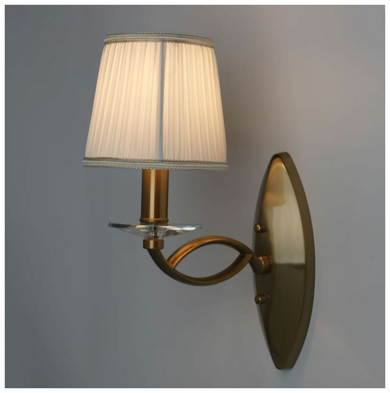 Металлическое основание настенного бра гальванизировано в цвет медовая бронза. Источник света закрыт белым текстильным абажуром. Вертикальное бра декорировано массивом хрусталя.