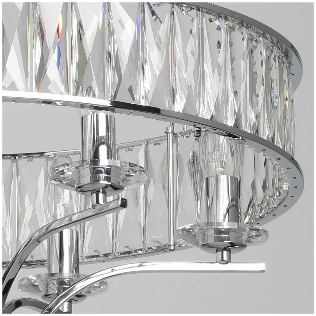 Металлическое основание светильника гальванизировано в цвет хрома. Люстра декорирована прозрачным хрусталем прямоугольной формы и декоративными розетками из массива хрусталя.
