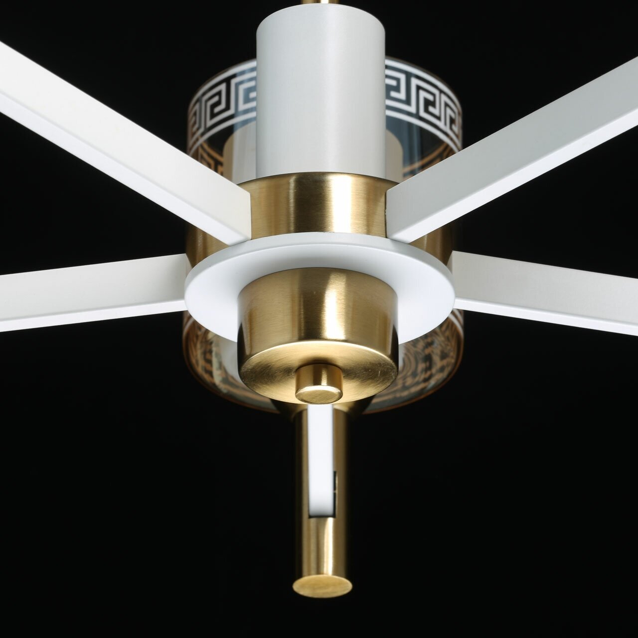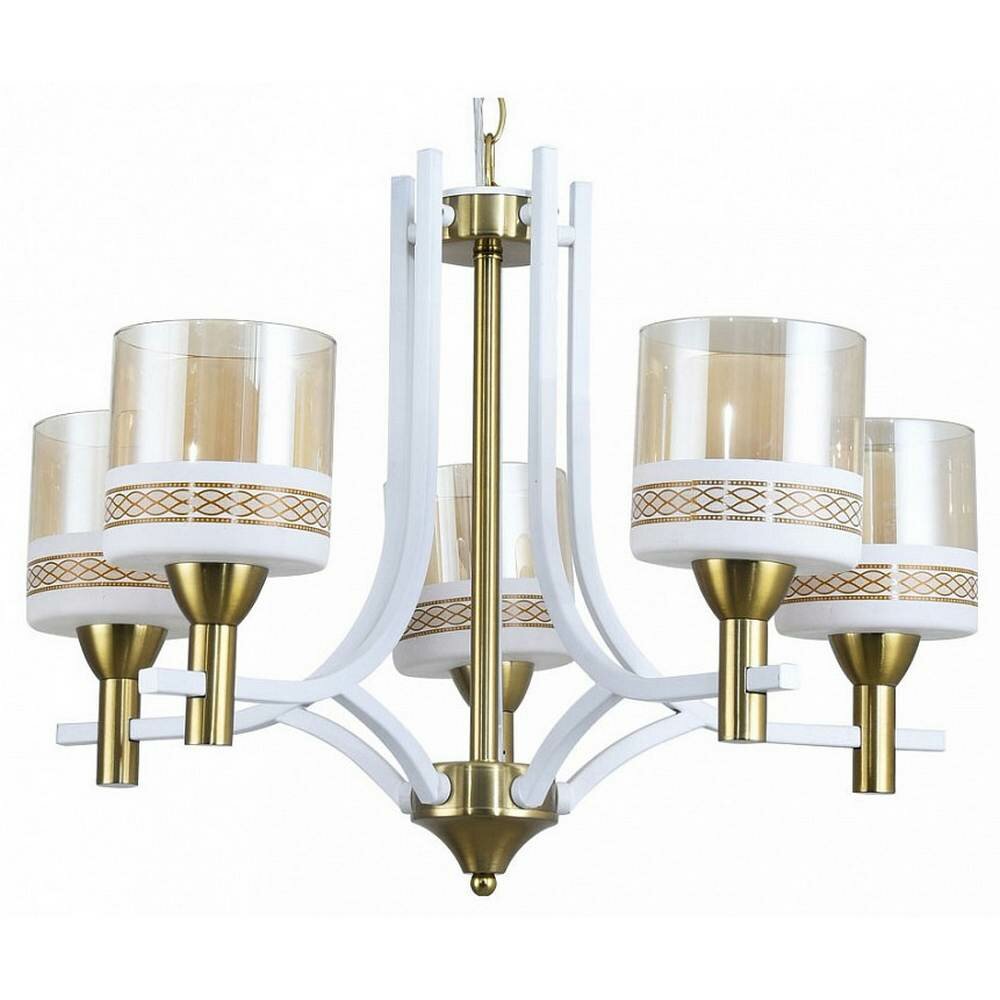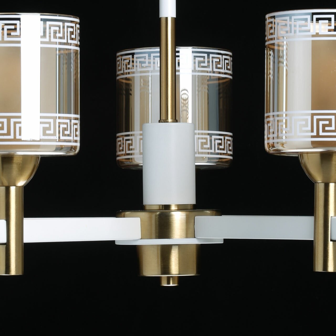 Модное сочетание белого и золотого придает люстре стиль и изысканность. Универсальный дизайн подойдет в современный интерьер. Прямые линии отражают тренд на геометричность. Двойные стеклянные плафоны создают яркий и оригинальный сценарий освещения. Заменяемые источники света удобны в эксплуатации. Возможность регулировать высоту. Металлическое основание подвесной люстры окрашено в белый цвет. Отдельные элементы основания гальванизированы в цвет золота. Источники света закрыты двойными стеклянными плафонами, где внутренний плафон матирован, а внешний плафон гальванизирован в цвет шампань. На внешние плафоны белой краской по трафарету нанесен орнамент в греческом стиле.