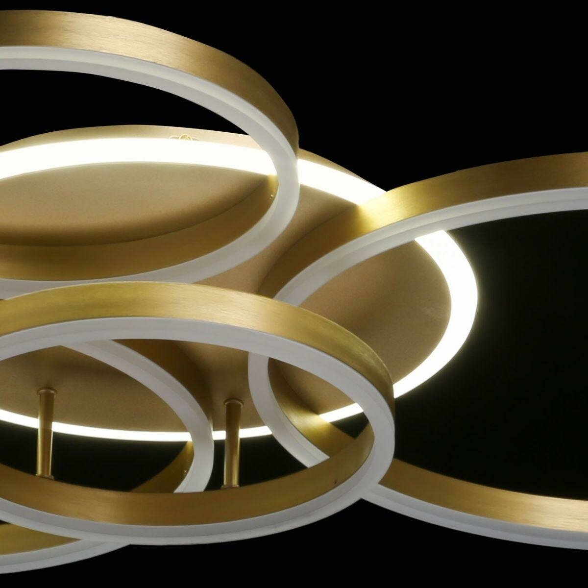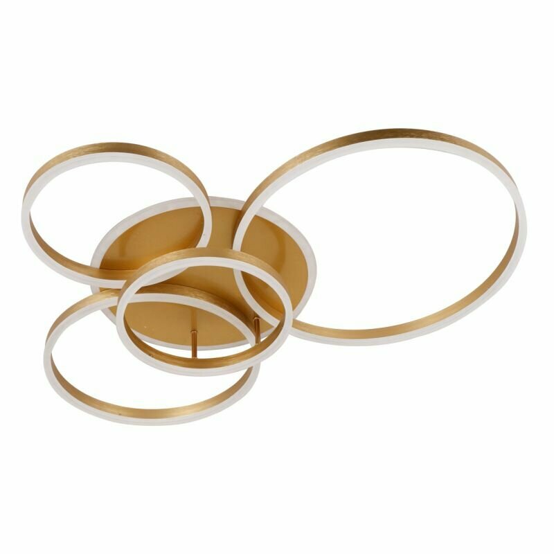 Компактный светильник для стандартной высоты потолка. Металлическое основание потолочной люстры окрашено в цвет золота. Плафоны выполнены из сплава алюминия с цинком, обработаны по технологии брашинг и окрашены в цвет основания. Светодиодные источники света закрыты матовым акрилом.