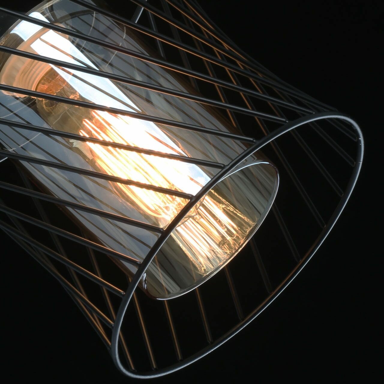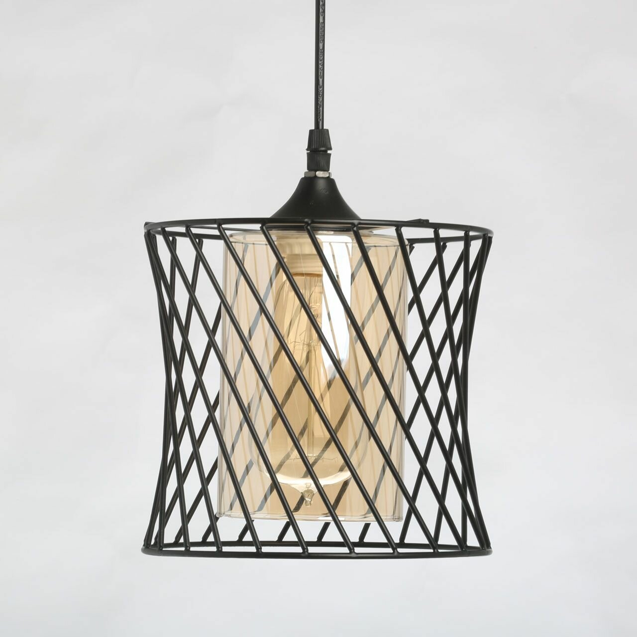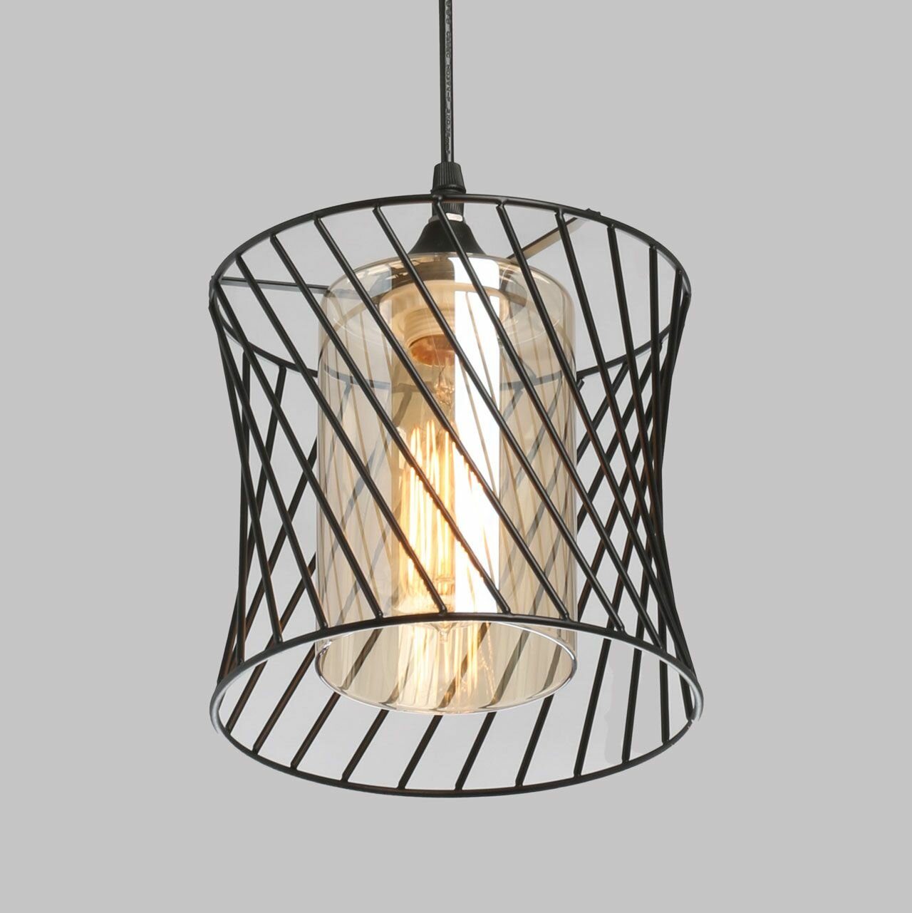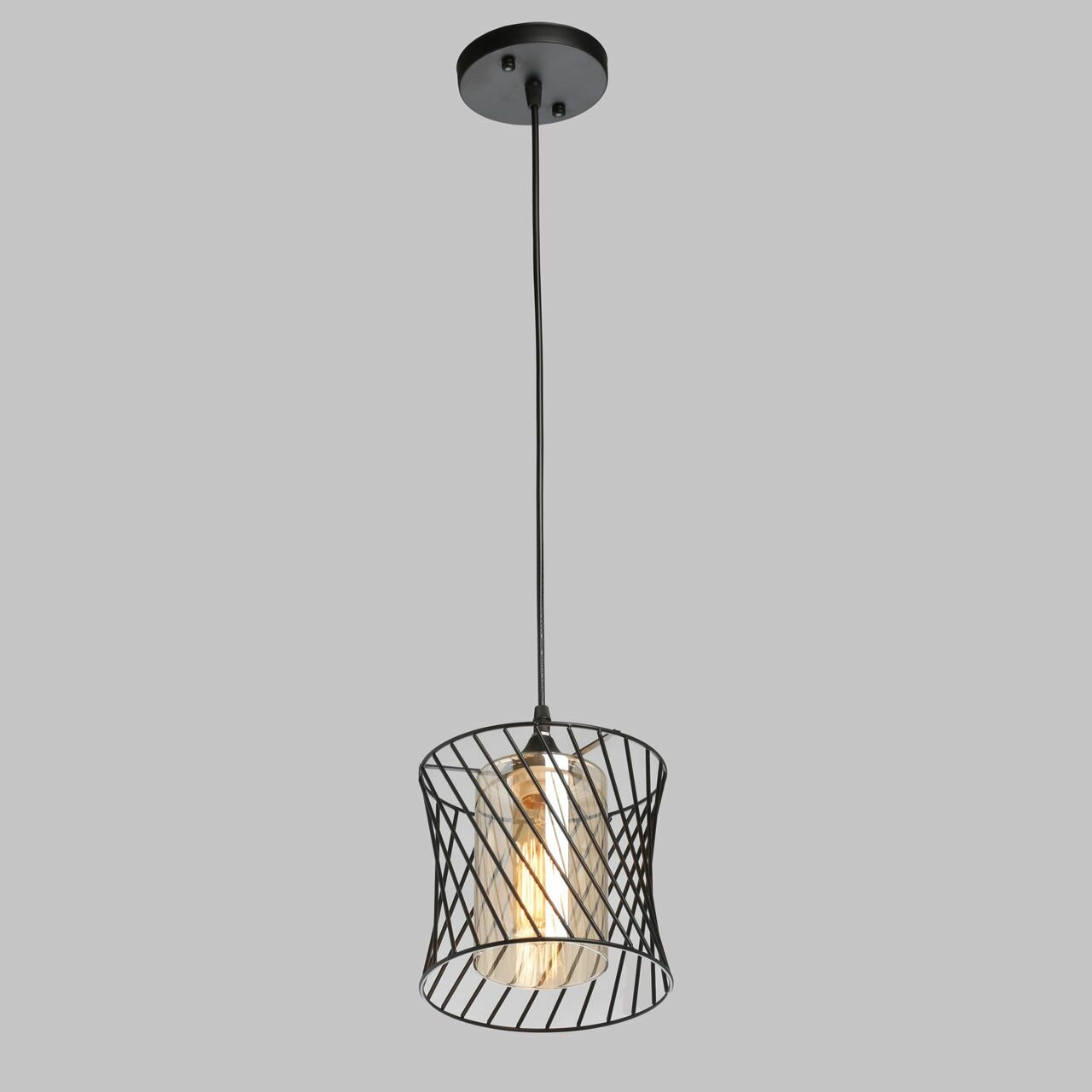 Металлическое основание и плафон подвесного светильника окрашены в черный цвет. Стеклянный внутренний плафон гальванизирован в цвет шампань.