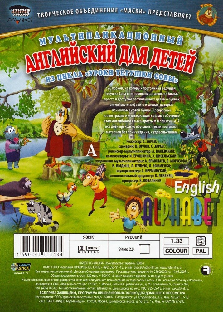 Мультфильмы очень красочные. Моя двухлетняя дочурка оценила диск по достоинству. До этого она признавала только м/ф. "Маша и Медведь", а теперь смотрит и этот мультфильм и пытается повторить слова. Все, что объясняет на уроках Тетушка Сова ребенку понятно, поскольку объяснения идут на русском языке. На английском демонстрируются буквы и существительные, начинающиеся на определенную букву и фразы приветствия. В конце каждой темы стишок на английском языке. Но просмотром мультфильмов мы...