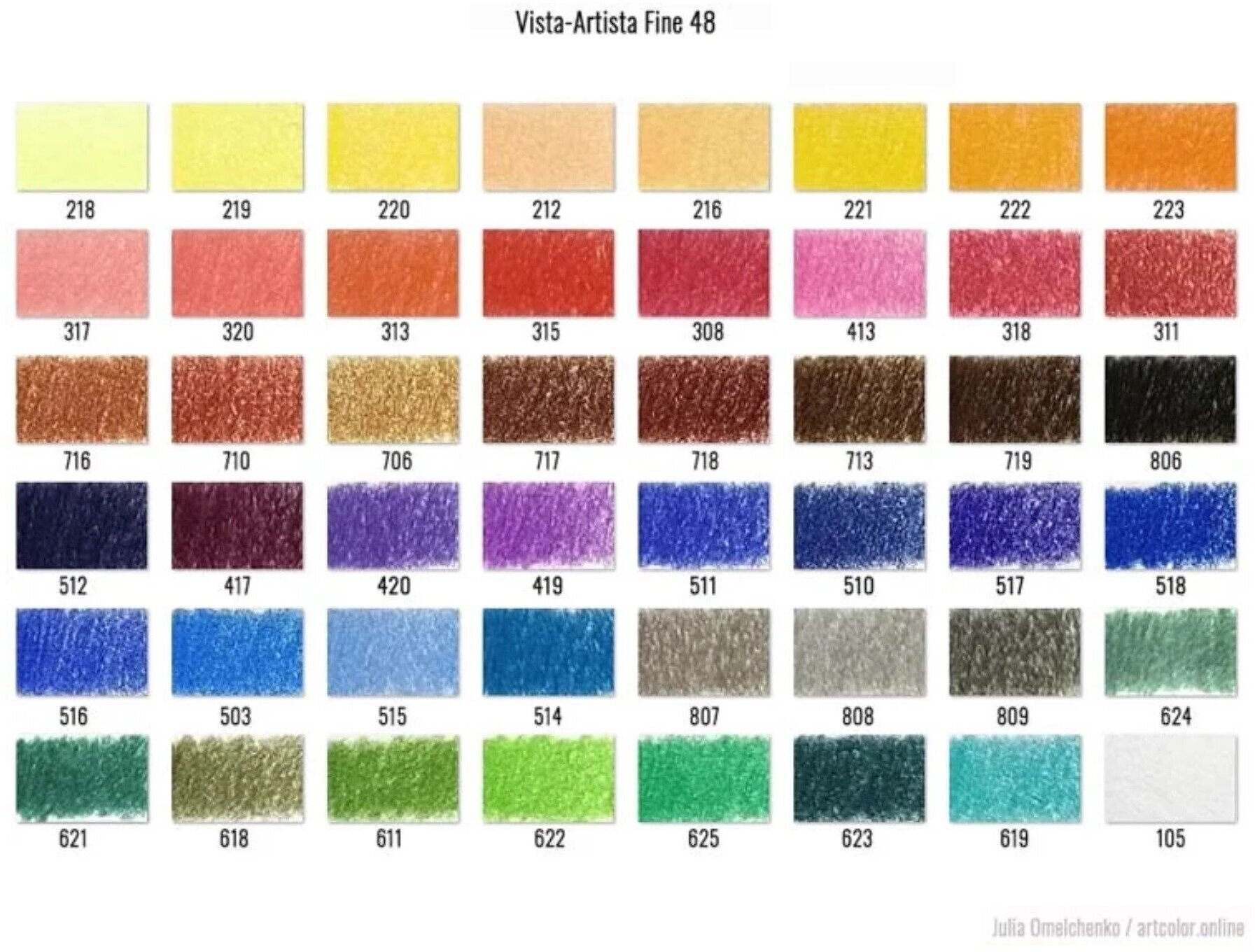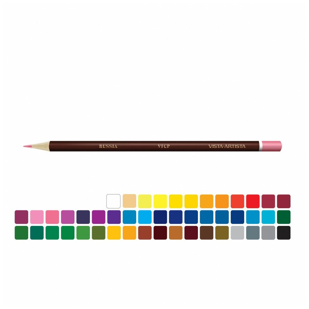 "VISTA-ARTISTA" Fine VFCP-48 Профессиональные цветные карандаши с высоким содержанием пигмента. Отличаются яркими насыщенными оттенками. Цвета идеально накладываются друг на друга и отлично смешиваются. Подходят для широкого спектра техник. Предназначены для художников, графиков, дизайнеров, архитекторов, и творческих людей.