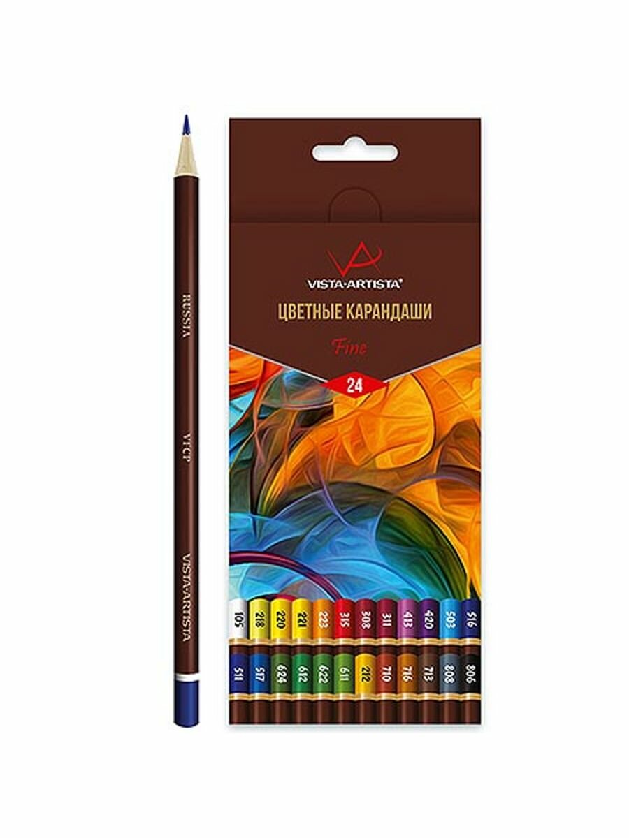 "VISTA-ARTISTA" Fine VFCP-24 Профессиональные цветные карандаши с высоким содержанием пигмента. Отличаются яркими насыщенными оттенками. Цвета идеально накладываются друг на друга и отлично смешиваются. Подходят для широкого спектра техник. Предназначены для художников, графиков, дизайнеров, архитекторов, и творческих людей.