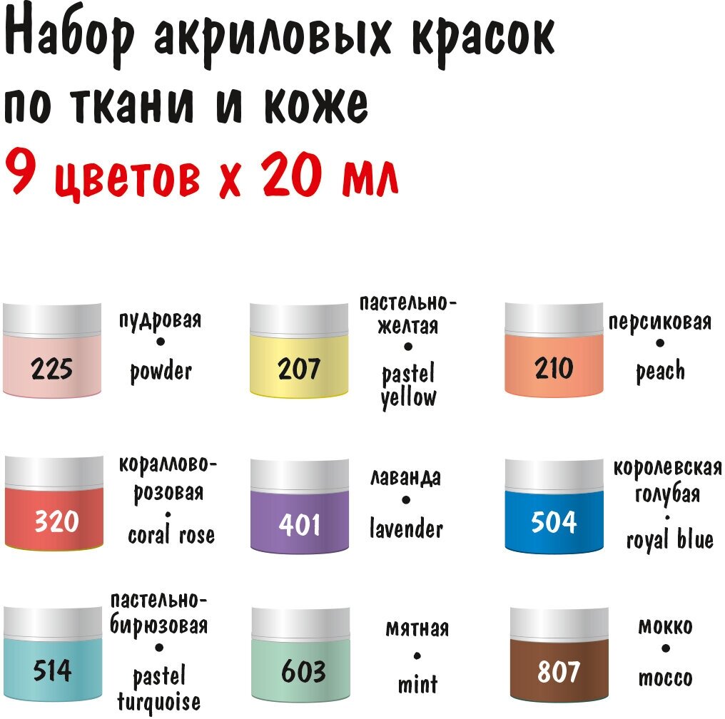 Набор красок по ткани и коже 9 цветов по 20 мл.