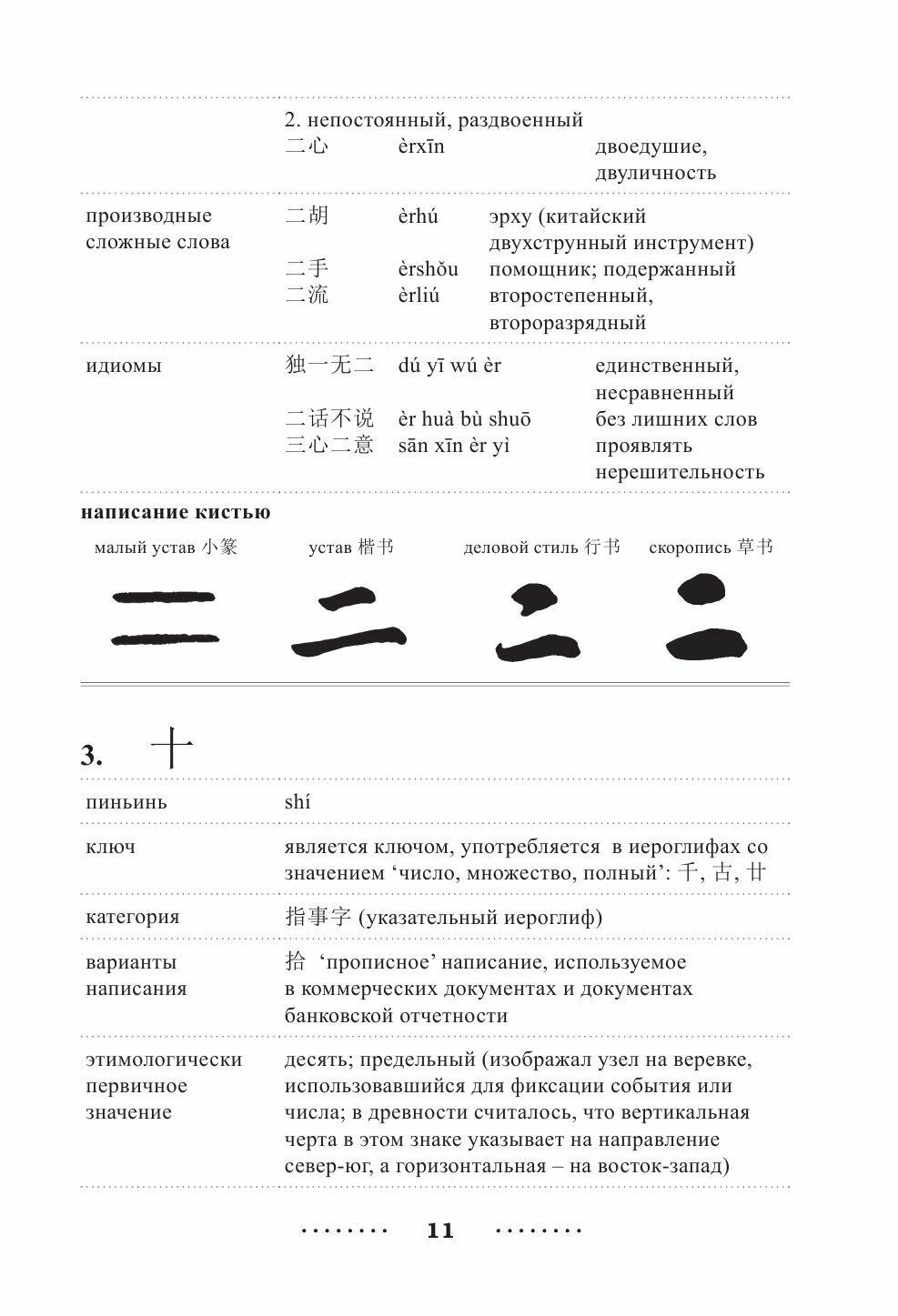 Каждая статья содержит пиньинь, этимологию и примеры употребления, а также четыре вида написания иероглифа, начертанных кистью профессиональным каллиграфом. Иероглифы идут в порядке, удобном для овладения написанием кистью самостоятельно.