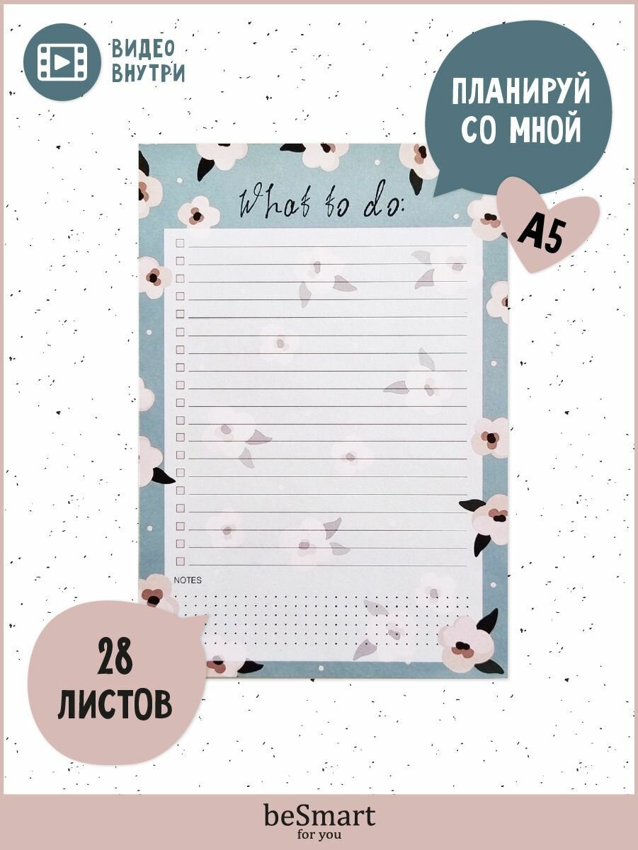 "Pretty" - романтичная и деликатная цветочная коллекция от Be Smart с нотками французского шарма. Прекрасная в своей простоте, она раскрывается нежными флористическими мотивами.Залог успеха - это тайм-менеджмент и грамотное распределение дел. С этим тебе точно поможет наш отрывной планнер "Список дел" на неделю А5 формата (145х210 мм), который комфортно всегда держать под рукой. Удобное клеевое скрепление позволяет легко удалять листы из планнера.Сам блок на 28 листов - из плотной белой бумаги плотностью 80 г/м2 с цветной печатью с одной стороны и прямыми уголками.Всю неделю ты можешь записывать свои задачи, проставлять отметки об их выполнении и добавлять заметки. Никогда планирование ещё не было таким приятным процессом!