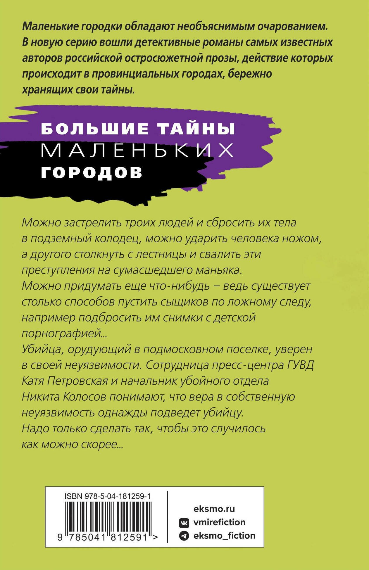 Можно застрелить троих людей и сбросить их тела в подземный колодец, можно ударить человека ножом, а другого столкнуть с лестницы и свалить эти преступления на сумасшедшего маньяка. Можно придумать еще что-нибудь - ведь существует столько способов пустить сыщиков по ложному следу, например, подбросить им снимки с детской порнографией… Убийца, орудующий в подмосковном поселке, уверен в своей неуязвимости. Сотрудница Пресс-центра ГУВД Катя Петровская и начальник "убойного отдела" Никита Колосов понимают, что вера в собственную неуязвимость однажды подведет убийцу. Надо только сделать так, чтобы это случилось как можно скорее…