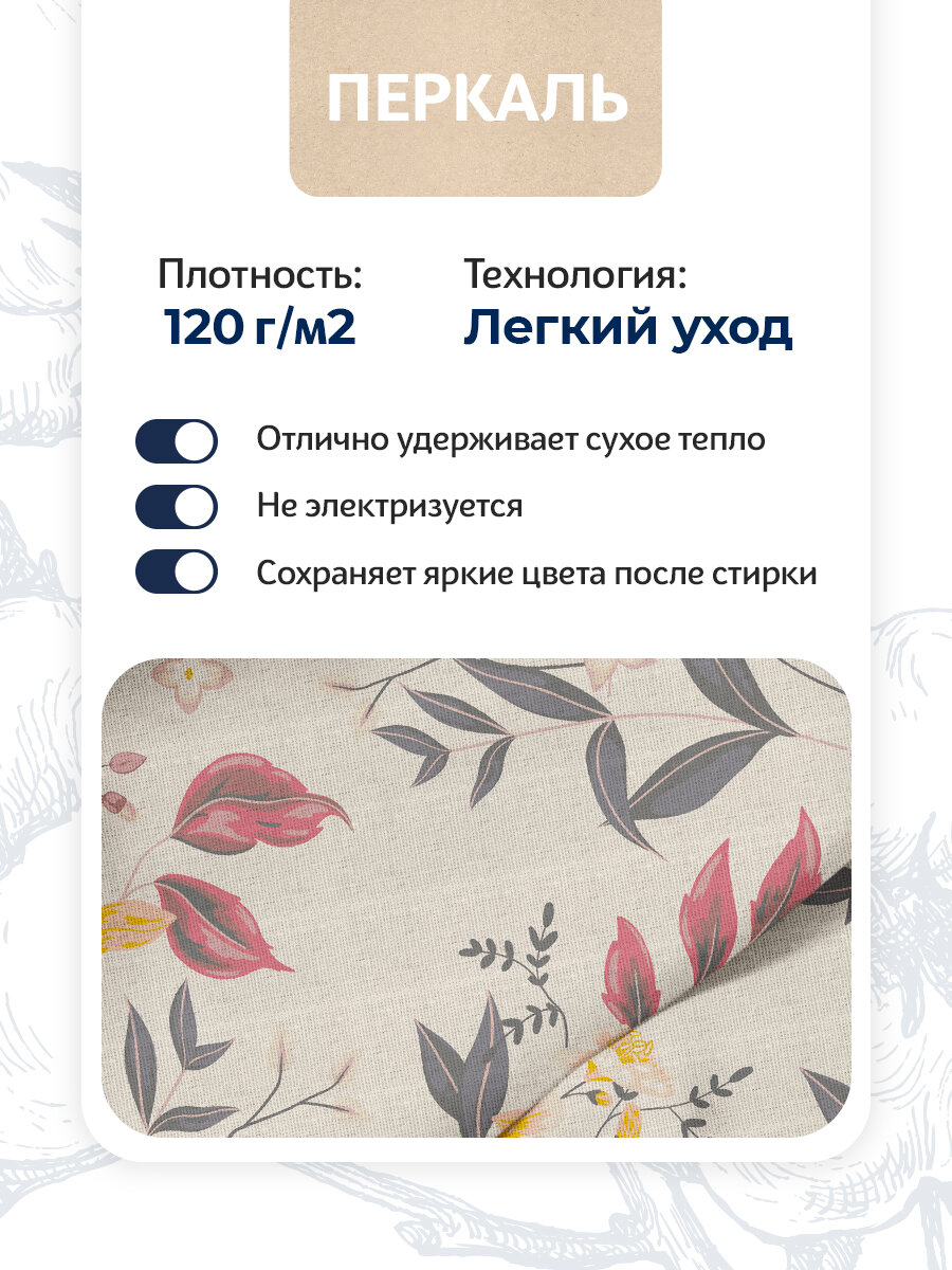 Комплект постельного белья Волшебная Ночь Евро 220x240 см, Charm - это высококачественное постельное белье из перкаля. Перкаль - это плотная и прочная ткань, которая не скользит и не электризуется. Комплект состоит из пододеяльника 200x220 см, двух наволочек 50x70 см и одной простыни 220x240 см. Цвет комплекта - полубелый с геометрическим рисунком в виде растений, полоски и цветов. Комплект выполнен из 100% хлопка, что обеспечивает комфорт и мягкость при использовании. Размер пододеяльника и наволочек идеально подходит для евростандарта. Пододеяльник имеет застежку в форме прорези без застежки, а простыня и наволочки - стандартные размеры. Комплект "Волшебная ночь" идеально подойдет для комфортного сна и создания уютной атмосферы в вашей спальне. Он не создает парниковый эффект и не раздражает кожу, а также приятен на ощупь. Его можно стирать при температуре до 40°C. Приобретая этот комплект, вы получаете высококачественное постельное белье, которое будет радовать вас долгие годы.