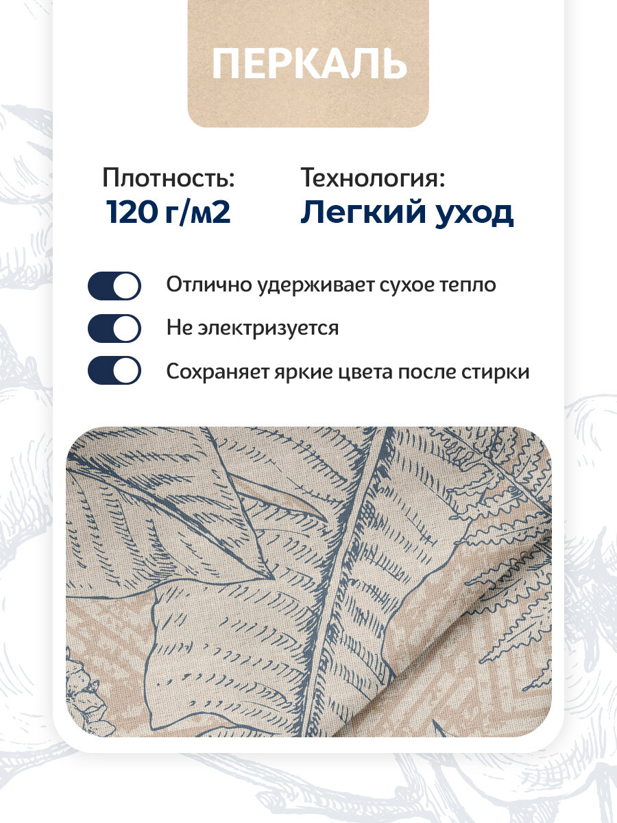 Дорогой покупатель, постельное белье двуспальное ВОЛШЕБНАЯ НОЧЬ из коллекции ЭКО изготовлено из ткани перкаль, материал 100% хлопок плотностью 120 г/м2. В комплект входят 1 наволочка 50x70 см, пододеяльник 180x215 см и простыня 200х220. Обратите внимание, что отверстие под одеяло не имеет молнии или пуговиц и простынь в комплект не входит. С постельным бельем ECO Вы заботитесь о планете и экологии, ведь мягкие и абсолютно натуральные ткани коллекции созданы из хлопка, они гипоаллергенны и безопасны для здоровья и окружающей среды. На поверхности ткани Вы можете заметить небольшие крапинки – это ещё одно подтверждение натуральности коллекции ЭКО. При деликатной и экологичной обработке мельчайшие частицы хлопковых коробочек могут присутствовать на готовом полотне. По мере эксплуатации комплекта и в процессе стирки частички постепенно вымываются, а натуральная ткань становится ещё мягче и приятнее к телу. Преимущества перкаля. - Мягкость и комфорт, белье не колется и не раздражает кожу. - Перкаль подстраивается под температуру тела, не создает парникового эффекта. - Прочность и долговечность. - Стойкость к физическим воздействиям. - Мягче, чем сатин. За товаром очень легко ухаживать. Его можно гладить утюгом при температуре до 150? и стирать при температуре до 40?. Благодаря качественным красителям товар сохраняет цвета после правильной стирки и не выцветает. При неправильном уходе возможна усадка ткани до 5% согласно ГОСТ. В производстве белья из перкаля мы используем только экологически чистые материалы высочайшего качества. Гипоаллергенная ткань из органического хлопка подходит для людей с чувствительной кожей или аллергией. Поэтому данное постельное белье можно застилать для детей и для беременных, а также оно подходит для людей с атопическим дерматитом. Классический пододеяльник является отличной альтернативой для вариантов на молнии и на пуговицах, так как при длительной эксплуатации и частых стирках ничего не оторвется и не заржавеет. Постельное белье выполнено в различных трендовых цветах, которые оценят дети и подростки, оно отлично подойдет для мальчика и для девочки. Дизайны в коллекции универсальны, поэтому комплект также подойдет для мужчины и для женщины. Отдыхая на этом постельном, вы окунетесь в атмосферу итальянского романтизма и создадите идеальное место для отдыха и восстановления сил. Порадуйте любимую на 8 марта или своего защитника на 23 февраля. Подарите себе и близким по-настоящему комфортный сон на Новый год или на день рождения.