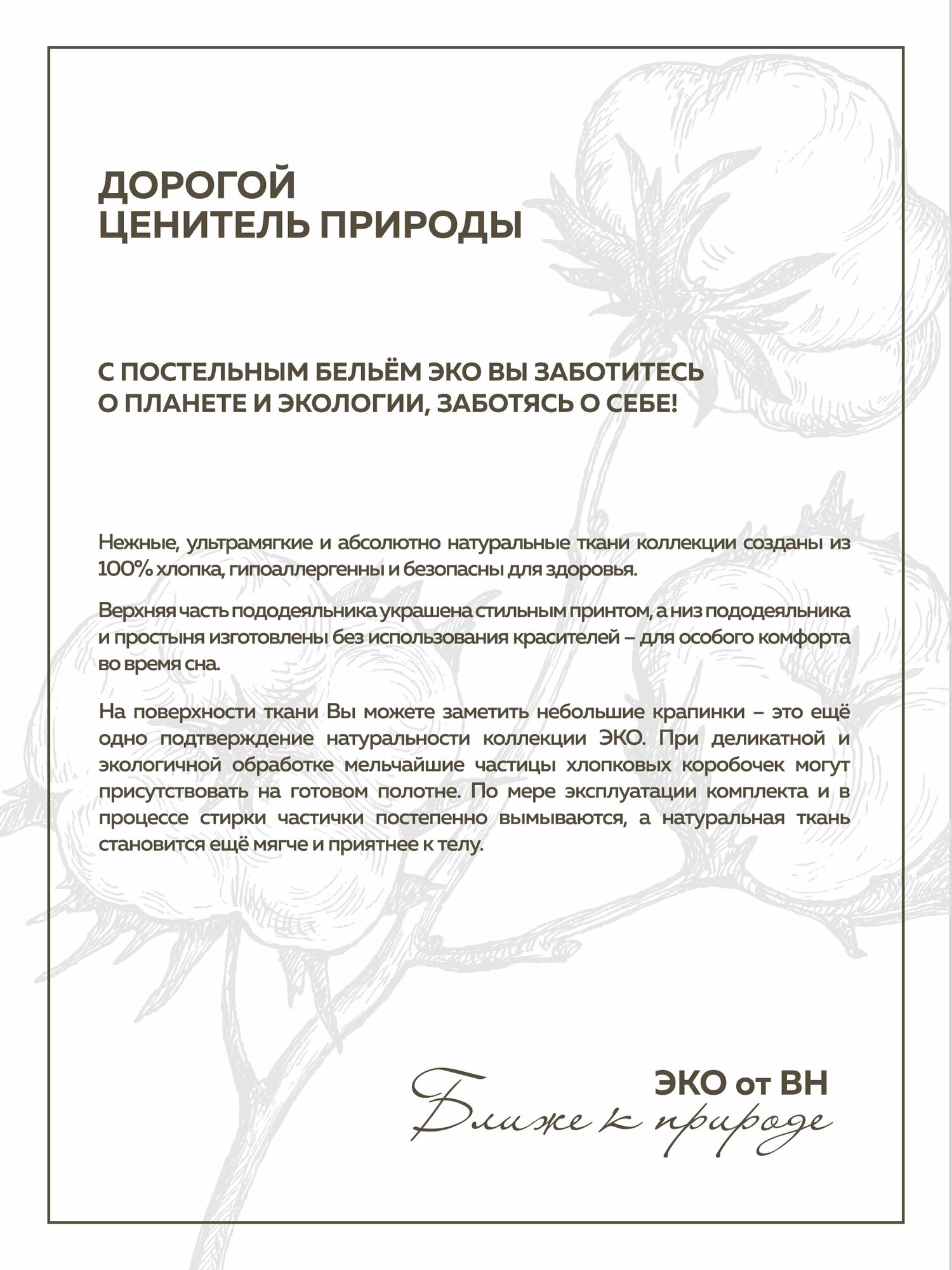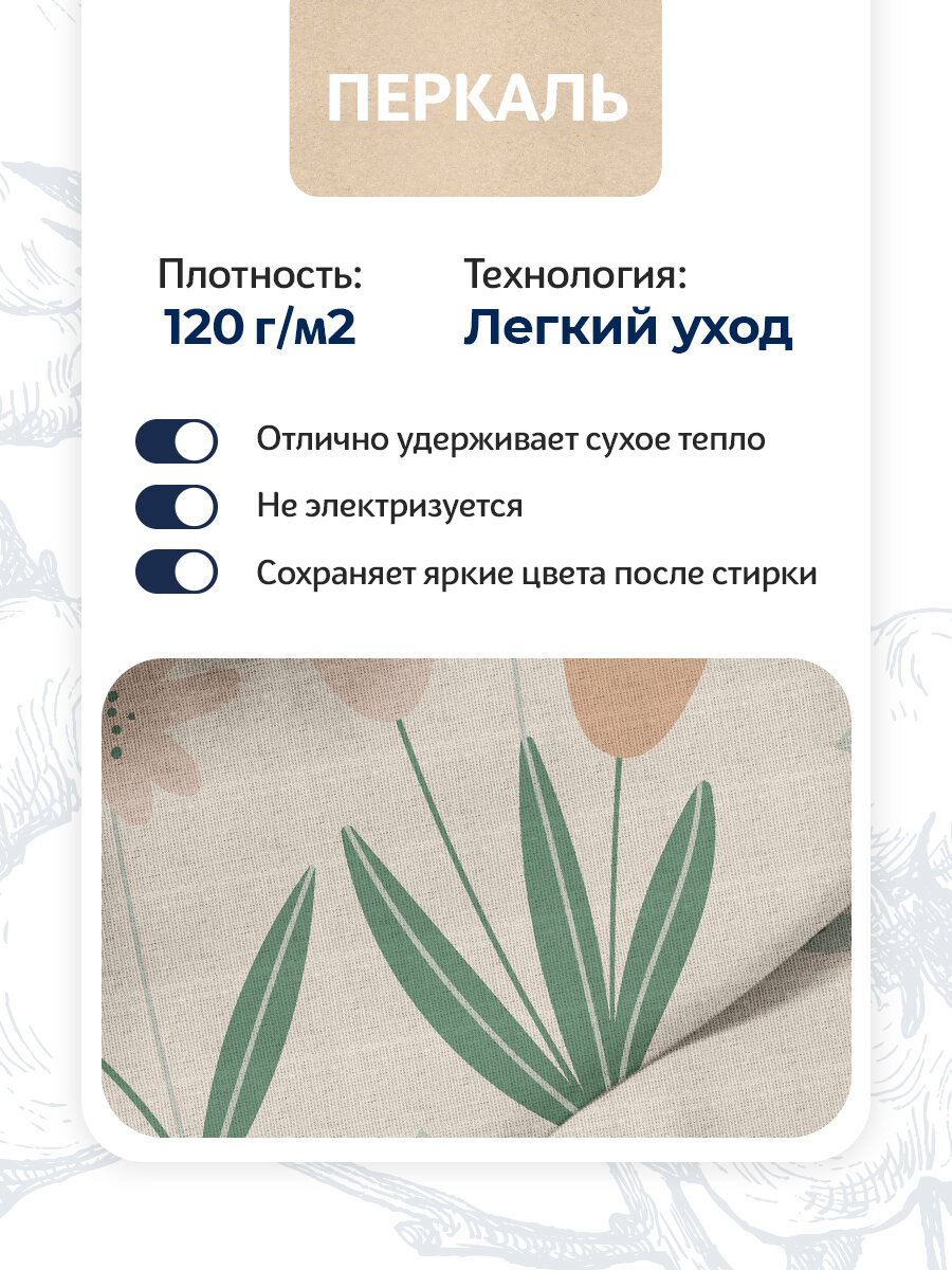 Дорогой покупатель, постельное белье двуспальное ВОЛШЕБНАЯ НОЧЬ из коллекции ЭКО изготовлено из ткани перкаль, материал 100% хлопок плотностью 120 г/м2. В комплект входят наволочка 50x70 см, пододеяльник 180x215 см и простыня 200х220. Обратите внимание, что отверстие под одеяло не имеет молнии или пуговиц и простынь в комплект не входит. С постельным бельем ECO Вы заботитесь о планете и экологии, ведь мягкие и абсолютно натуральные ткани коллекции созданы из хлопка, они гипоаллергенны и безопасны для здоровья и окружающей среды. На поверхности ткани Вы можете заметить небольшие крапинки – это ещё одно подтверждение натуральности коллекции ЭКО. При деликатной и экологичной обработке мельчайшие частицы хлопковых коробочек могут присутствовать на готовом полотне. По мере эксплуатации комплекта и в процессе стирки частички постепенно вымываются, а натуральная ткань становится ещё мягче и приятнее к телу. Преимущества перкаля. - Мягкость и комфорт, белье не колется и не раздражает кожу. - Перкаль подстраивается под температуру тела, не создает парникового эффекта. - Прочность и долговечность. - Стойкость к физическим воздействиям. - Мягче, чем сатин. За товаром очень легко ухаживать. Его можно гладить утюгом при температуре до 150 градусов и стирать при температуре до 40градусов. Благодаря качественным красителям товар сохраняет цвета после правильной стирки и не выцветает. При неправильном уходе возможна усадка ткани до 5% согласно ГОСТ. В производстве белья из перкаля мы используем только экологически чистые материалы высочайшего качества. Гипоаллергенная ткань из органического хлопка подходит для людей с чувствительной кожей или аллергией. Поэтому данное постельное белье можно застилать для детей и для беременных, а также оно подходит для людей с атопическим дерматитом. Классический пододеяльник является отличной альтернативой для вариантов на молнии и на пуговицах, так как при длительной эксплуатации и частых стирках ничего не оторвется и не заржавеет. Постельное белье выполнено в различных трендовых цветах, которые оценят дети и подростки, оно отлично подойдет для мальчика и для девочки. Дизайны в коллекции универсальны, поэтому комплект также подойдет для мужчины и для женщины. Отдыхая на этом постельном, вы создадите идеальное место для отдыха и восстановления сил. Порадуйте любимую на 8 марта или своего защитника на 23 февраля. Подарите себе и близким по-настоящему комфортный сон на Новый год или на день рождения.