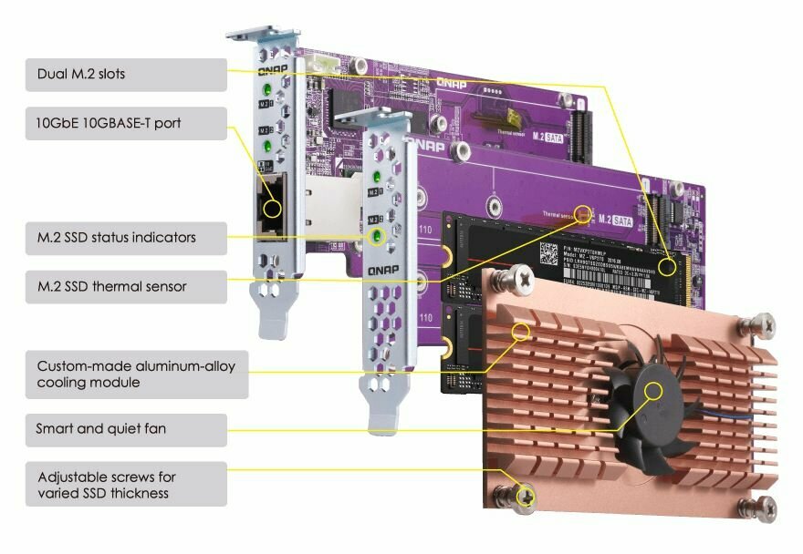 Устройство специфичное и далеко не всем нужное. Но для тех, кому необходимо учитывайте, что при установке двух плат QNAP QM2-2P10G1TB в один QNAP (одна над другой) штатные вентиляторы еле справляются. Надо либо увеличивать радиатор, либо смещать одну плату относительно другой. Недорогой удлинитель PCI-E решает проблему.