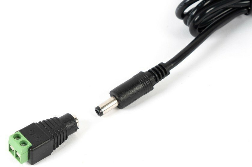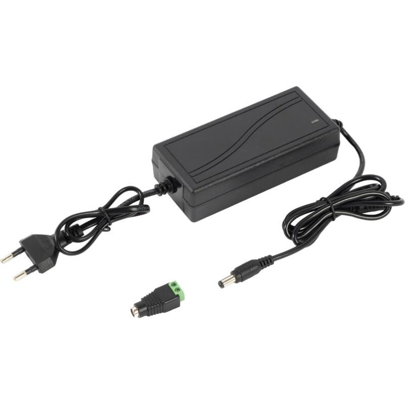 12В, 5А. Напряжение питающей сети 110-245 В переменного тока. Защита выхода от КЗ. Пластиковый корпус IP20. Подключение питания - сетевая вилка, подключение нагрузки - штекер 5,5х2,1 мм, переходник на клеммы в комплекте. Габаритные размеры - 50х30х110 мм.