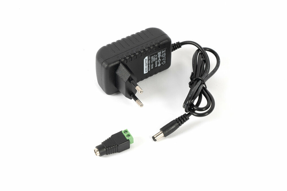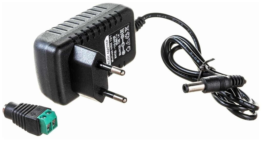12В, 1А. Напряжение питающей сети 110-245 В переменного тока. Защита выхода от КЗ. Пластиковый корпус IP20. Подключение питания - сетевая вилка, подключение нагрузки - штекер 5,5х2,1 мм, переходник на клеммы в комплекте. Габаритные размеры - 25х75х75 мм.