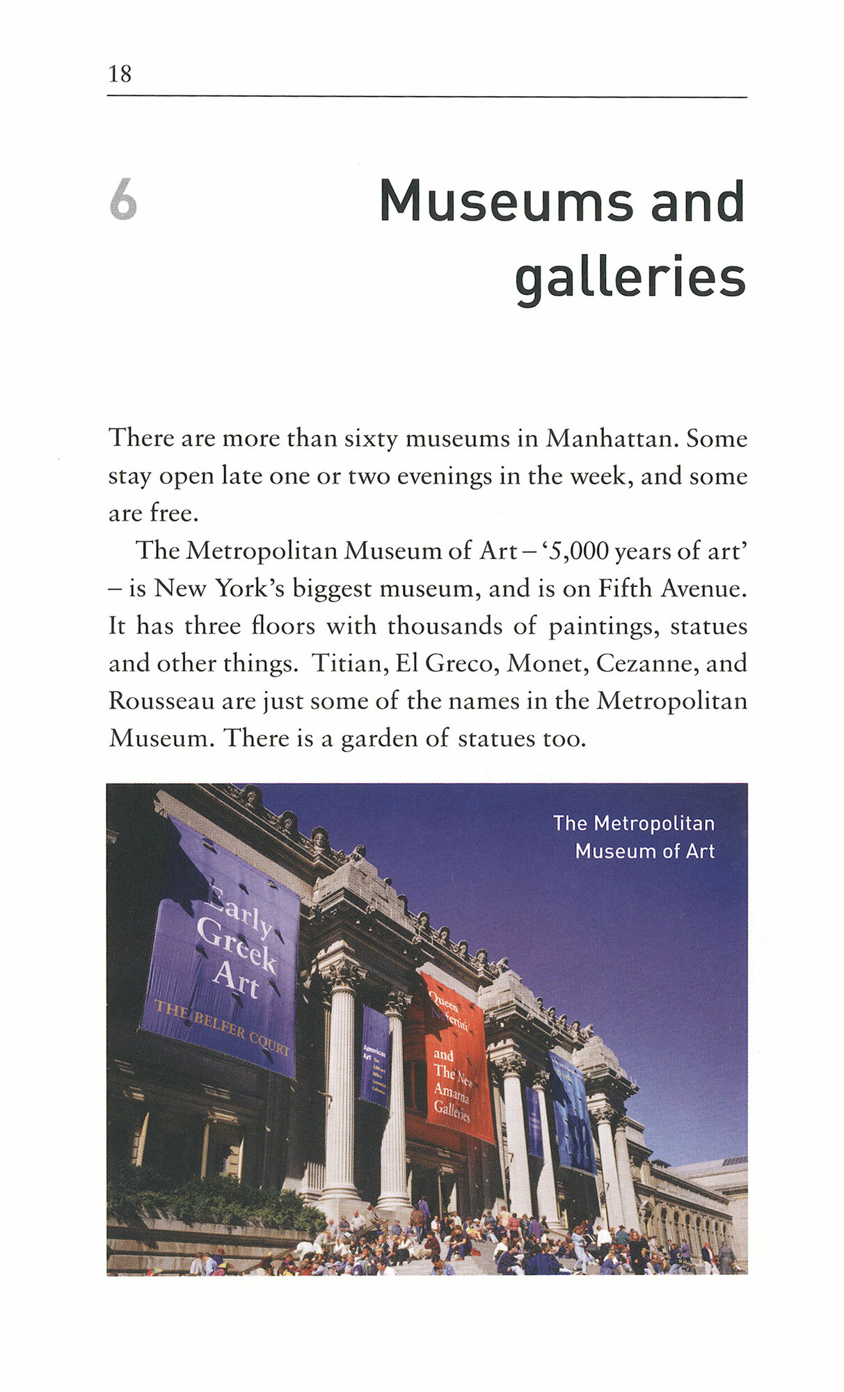 What can you do in New York? Everything! You can go to some of the world's most famous shops, watch a baseball game, go to the top of a skyscraper, see a concert in Central Park, eat a sandwich in a New York deli, see a show in a Broadway theatre. New York is big, noisy, and exciting, and it's waiting for you. Open the book and come with us to this wonderful city.