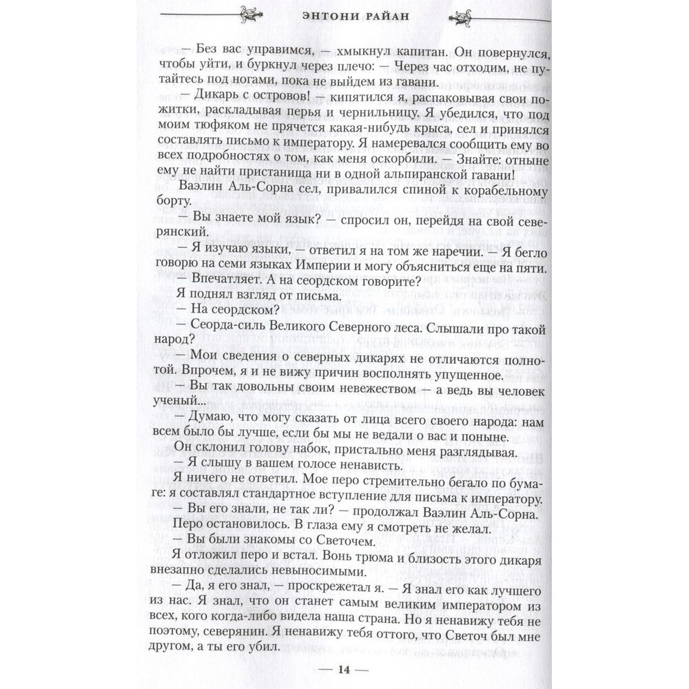 Один из самых высококачественных в плане литературного стиля приключенческих фэнтези - романов. Автор - Энтони Райан - учёный историк, мир у него получился интересным, а герои - живыми. Уникальные религиозные верования, мощная боевая подготовка и поединки, страшная и гнусная нечисть, война и тайные операции. А вот с любовью и юмором получилось поскромнее. С другой стороны, есть и альтернативно ориентированные персонажи, так что из читательской аудитории никто не уйдет обиженным.