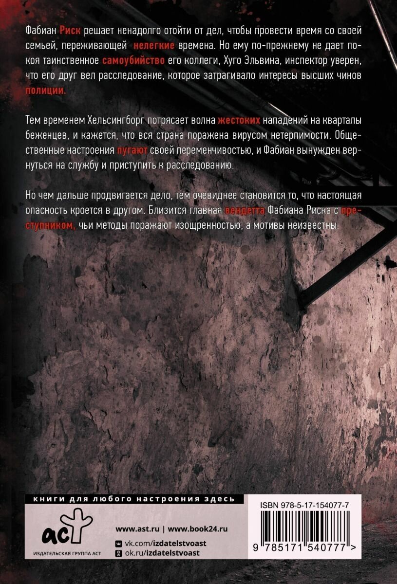 Четвертая книга о расследованиях Фабиана Риска. Здесь перемешано столько сюжетных коллизий, что остается только поражаться хитросплетениям темных тайн прошлого, сложных человеческих судеб и множеству скелетов в шкафах подозреваемых. Автор построил так повествование, что история не дает в итоге ответов на многие вопросов следствия. И только следующая часть цикла ответит на множество вопросов. Повествование очень динамичное, повороты сюжета удивляют!