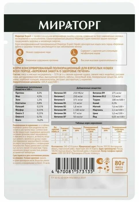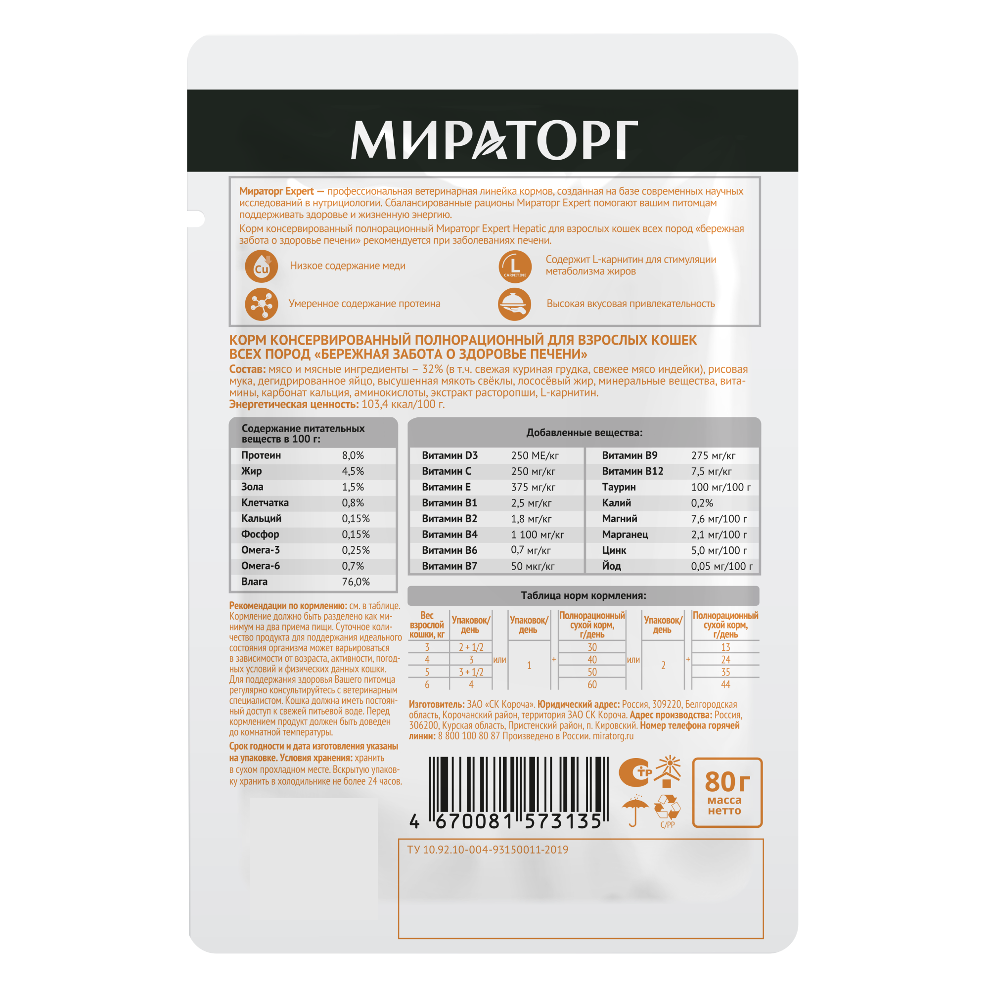Влажный корм для кошек Мираторг Expert Renal Бережная забота о здоровье печени 80г СК Короча