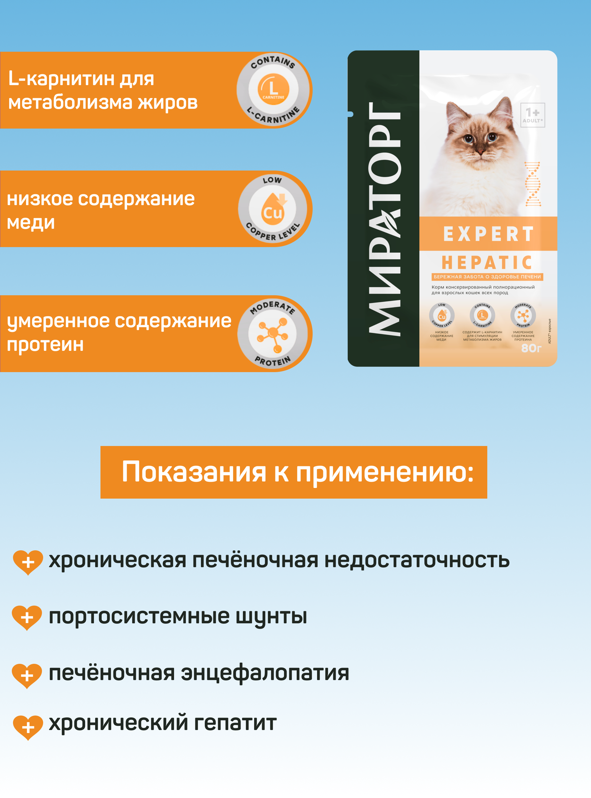 Мираторг Expert - профессиональная линейка кормов, созданная на базе современных научных исследований в нутрициологии. Сбалансированные рационы Мираторг Expert помогают вашим питомцам поддерживать здоровье и жизненную энергию. Hepatic – ветеринарная диета с низким содержанием меди, направленная для поддержания работы печени.
