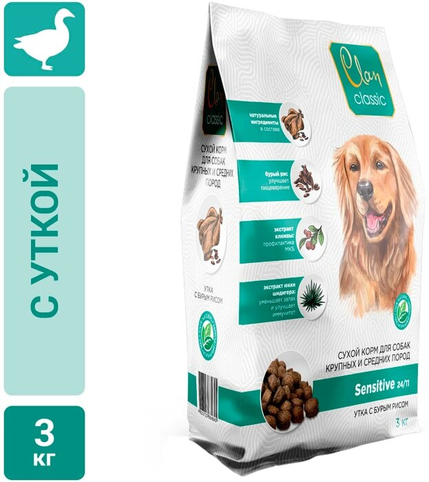 Сухой корм для собак больших и средних пород CLAN CLASSIC SENSITIVE-24/11 с чувствительным пищеварением имеет натуральный состав, не содержит искусственных консервантов и ароматизаторов. Бурый рис в составе способствуют лучшей усвояемости и улучшает пищеварение. Клюква - профилактика МКБ. Экстракт Юкки Шидигера - уменьшает запах и повышает иммунитет. Сочетание трав и ягод способствуют лучшей усвояемости и улучшает пищеварение. Корм содержит полноценный набор всех жизненно важных витаминов, минералов, антиоксидантов и аминокислот. Функциональные корма премиум качества по доступным ценам. Широкая вкусовая линейка. Идеальное соотношение цена/качество.