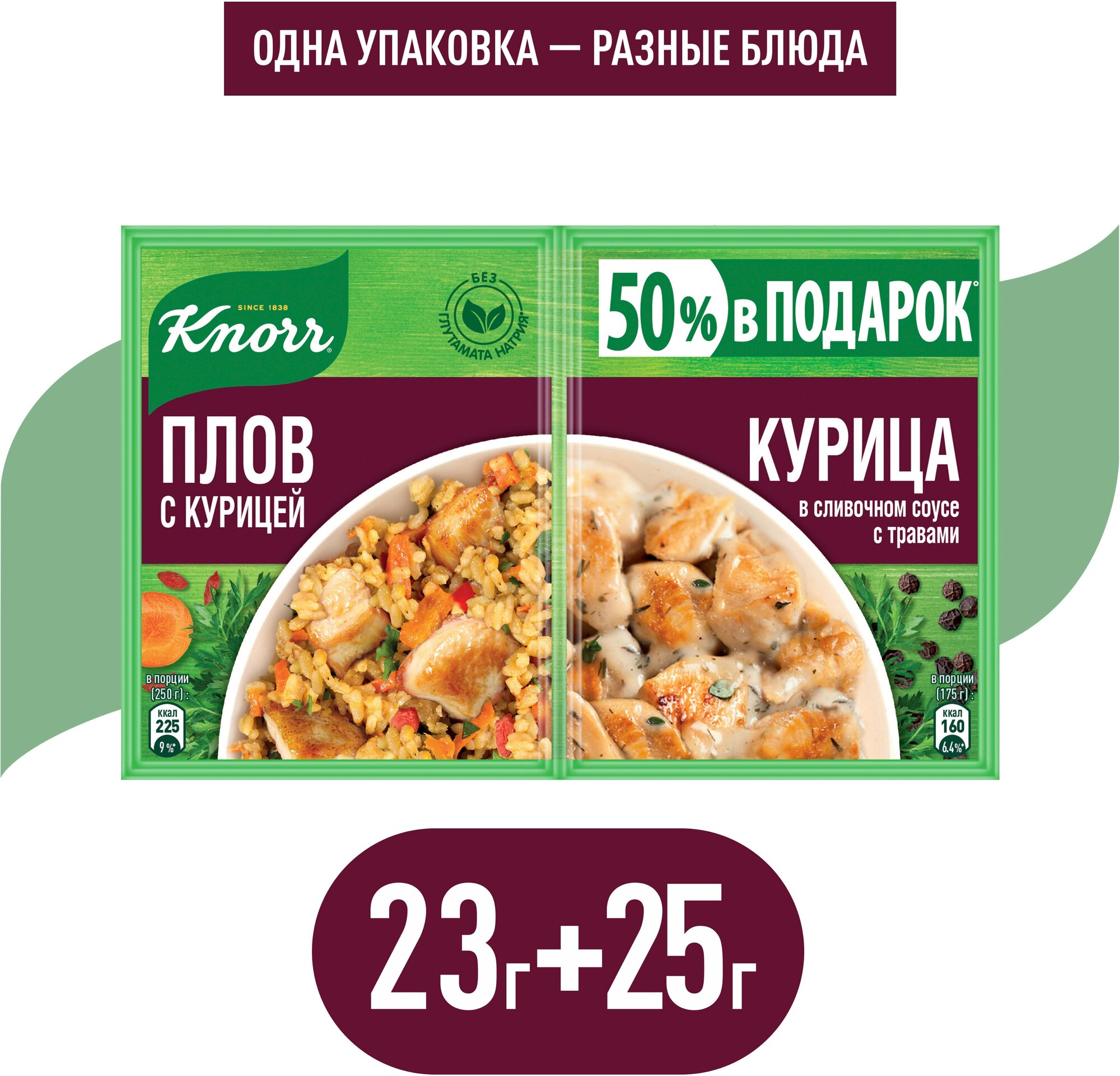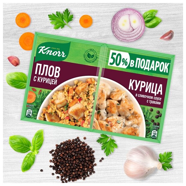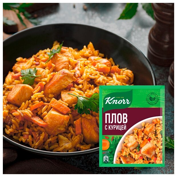 Коллекция Кнорр® На второе : сухая смесь для приготовления курицы в сливочном соусе с травами. Сухая смесь для приготовления плова. Превратите любой обед или ужин в настоящий праздник вместе с Knorr! В приправах из коллекции Knorr на второе только натуральные овощи, зелень и тщательно подобранные специи. Смешанные в идеальных пропорциях, они подарят вашим блюдам незабываемый вкус и аромат! В новой двойной упаковке с приправами Knorr сразу две идеи на второе! Приготовьте сочную курицу в сливочном соусе с итальянскими травами и ароматный восточный плов. Приправы не содержат усилителей вкуса, консервантов и ароматизаторов. Только натуральный вкус еды, приготовленной с любовью! Любовь — главный секрет хорошего повара. Любовь к своему делу помогает профессионалам создавать уникальные кулинарные шедевры. А любовь к своим близким дает стимул готовить что-то особенное даже в будние дни. Вместе с Knorr ваши любимые блюда готовятся гораздо быстрее и проще!