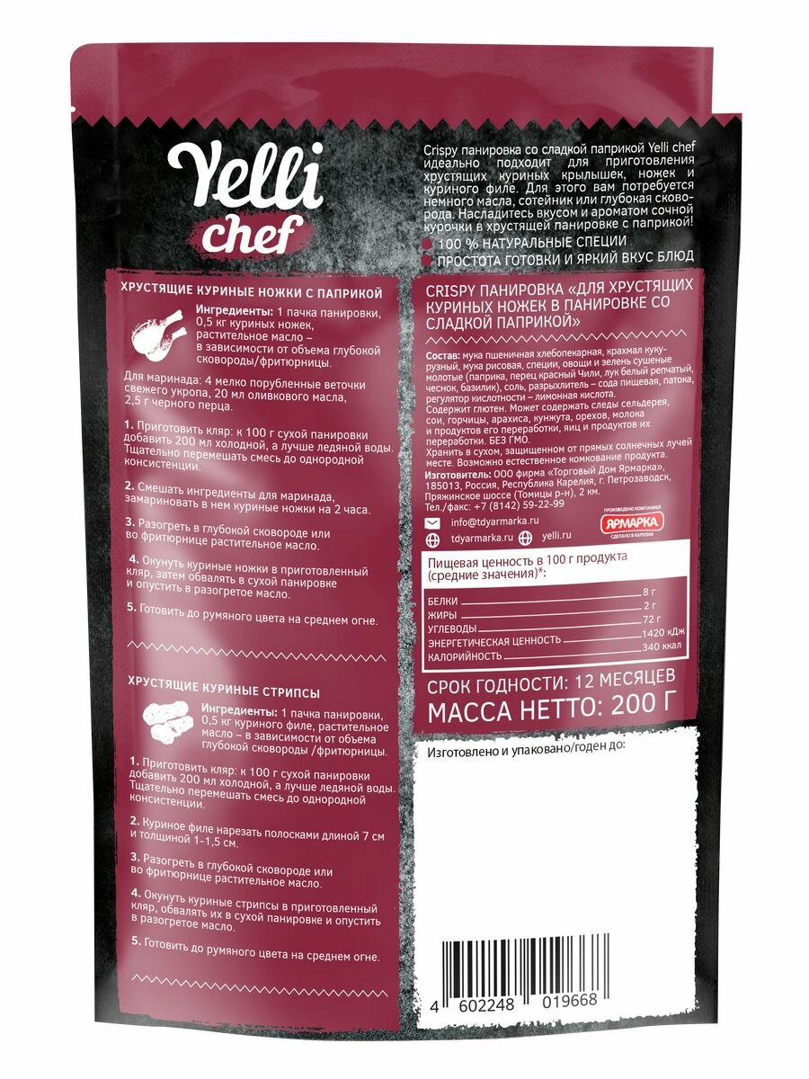 Панировка Yelli chef для хрустящих куриных ножек со сладкой паприкой 200г Торговый Дом Ярмарка