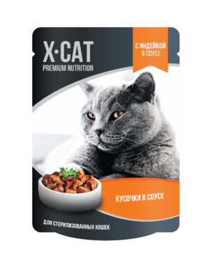 Консервированный полнорационный корм X-CAT для стерилизованных кошек. Кусочки с индейкой в соусе. Классический вкус курицы и индейки в нежнейшем соусе оценит даже самый взыскательный четвероногий гурман. Консервы X-CAT mdash; это высококачественный полнорационный корм, приготовленный из отборных ингредиентов с учетом особенностей метаболизма стерилизованной кошки. Сбалансированная формула содержит белки, жиры, углеводы, клетчатку, жирные кислоты омега-3 и омега-6, таурин и весь необходимый комплекс витаминов и минералов. Рекомендации по кормлению Для взрослой кошки среднего веса (4кг) требуется 3-4 пакетика в день. Суточная норма может варьироваться в зависимости от возраста, комплекции и уровня активности вашего питомца. Своевременно пополняйте миску свежей питьевой водой. Кошку следует кормить кормом комнатной температуры.