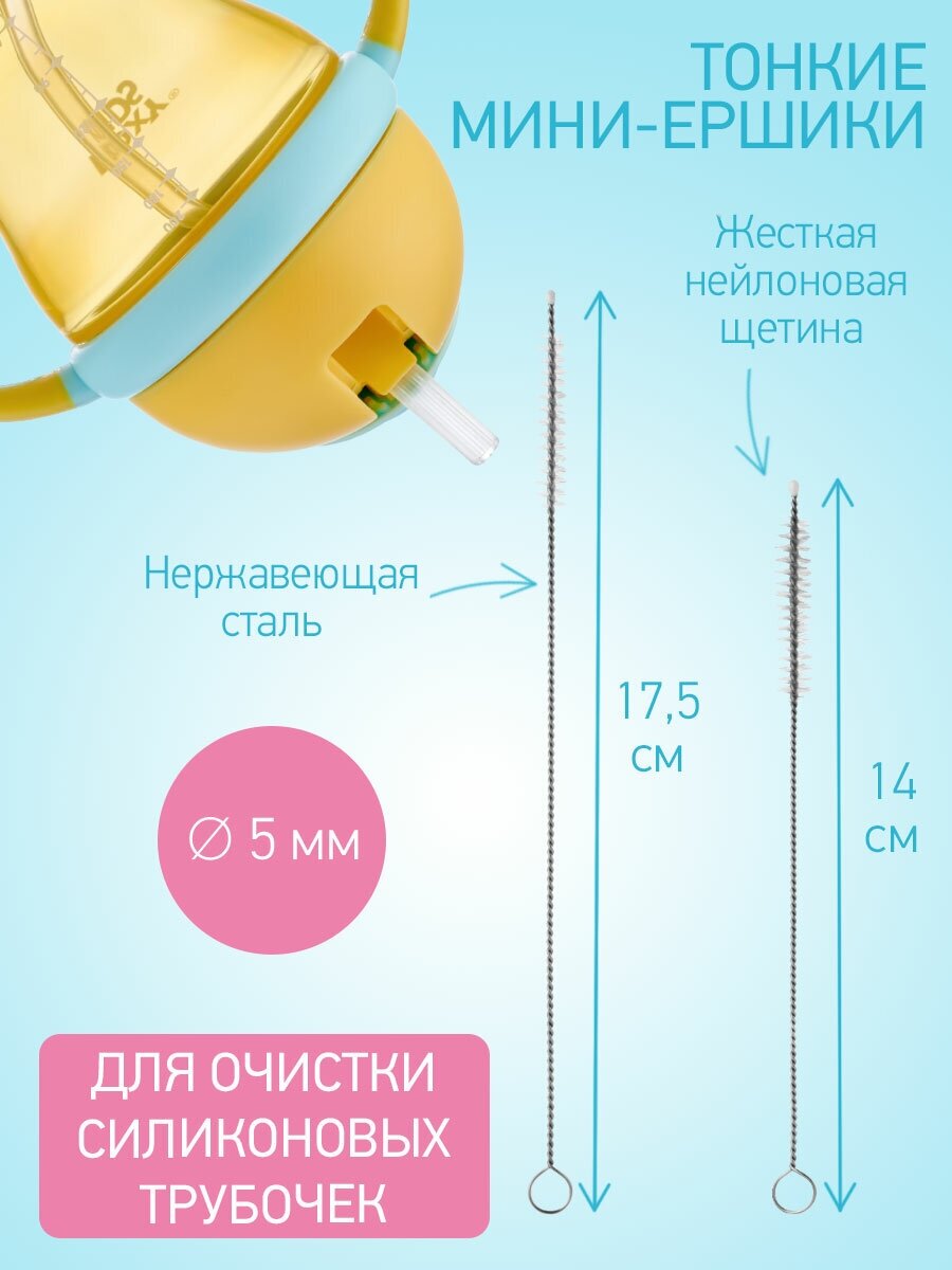 Маленькая щетка повторяет форму соски, а ручку в форме кольца удобно держать, надев на палец. Мини-ершик – незаменимый инструмент для очистки силиконовых трубочек от остатков напитков. Он имеет оптимальный диаметр 5 мм и долговечную жесткую нейлоновую щетину.