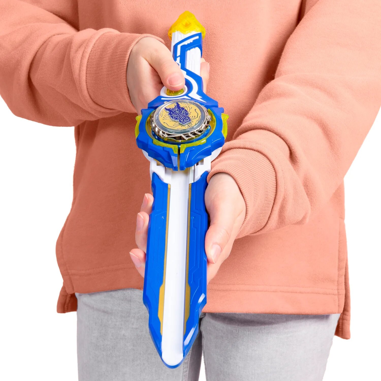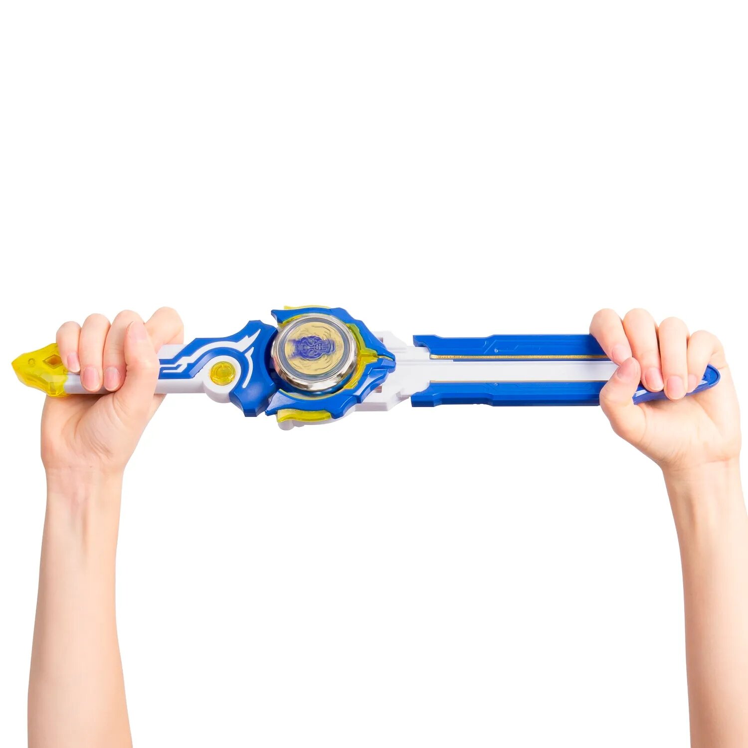 Он помогает точнее запустить блейд на арену. Меч не только пусковая установка, но и монтажный инструмент. Используй облегченный волчок для скоростного запуска. Его можно пересобирать: все элементы взаимозаменяемы внутри линейки Эпик Лончер. В наборе ты найдешь дополнительный аватар Надо. Вставь Надо в специальное отверстие до щелчка, раскрути волчок с помощью ножен, нажми кнопку запуска.