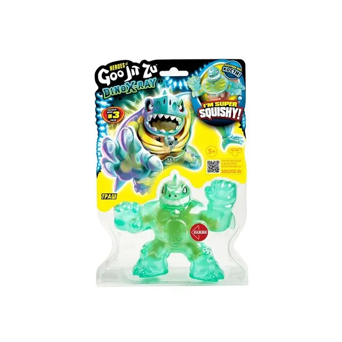 Герои Гуджитсу возвращаются в новой серии Дино Икс-Рэй. Траш готов к новой битве против других доисторических монстров. Растягивайте весёлого для друзей, но свирепого для врагов Траша, ведь он очень мягкий и супертягучий. Обладая невероятной суперсилой, он легко принимает свой первоначальный облик. Но этот парень не просто крутой снаружи, но и удивительный внутри. Сожмите Траша и увидите его кости сквозь эластичную кожу. Каждая фигурка имеет уникальный Гу-наполнитель. В серии Дино Икс-рэй есть и другие персонажи: Тайро, Тритопс, Шредз, Террэк и Блейзагот. А еще 2 новых набора и ультраредкий Смэшадон со светящимися в темноте косточками. Собери всю коллекцию Дино Икс-Рэй. Пришло время похрустеть костями.