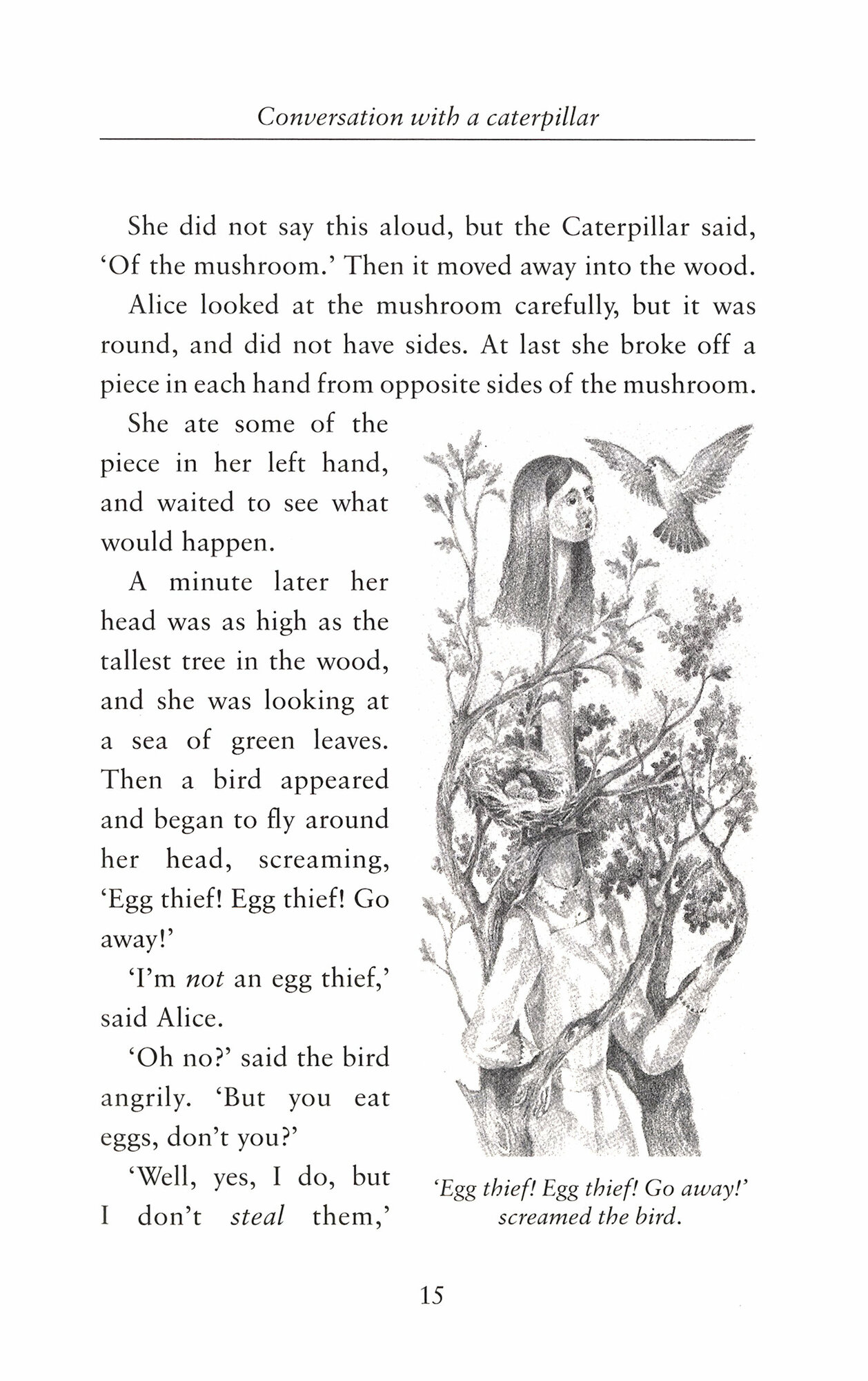 There, on top of the mushroom, was a large caterpillar, smoking a pipe. After a while the Caterpillar took the pipe out of its mouth and said to Alice in a slow, sleepy voice, 'Who are you?' What strange things happen when Alice falls down the rabbit-hole and into Wonderland! She has conversations with the Caterpillar and the Cheshire Cat, goes to the Mad Hatter's tea party, plays croquet with the King and Queen of Hearts...