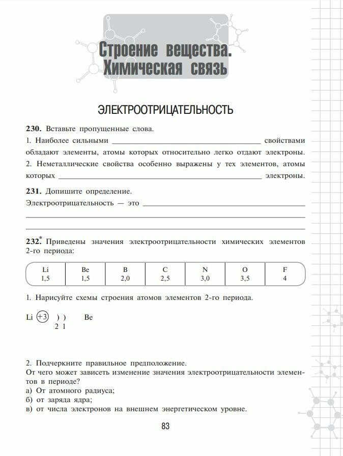 Рабочая тетрадь для учащихся входит в линию учебно-методических комплектов по химии Г. Е. Рудзитиса и Ф. Г. Фельдмана. Рабочая тетрадь может использоваться для выполнения домашних заданий, закрепления пройденного материала, самостоятельной проверки знаний и подготовки к контрольным работам. Звёздочкой обозначены задания повышенной сложности;