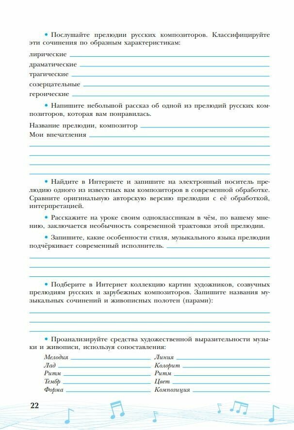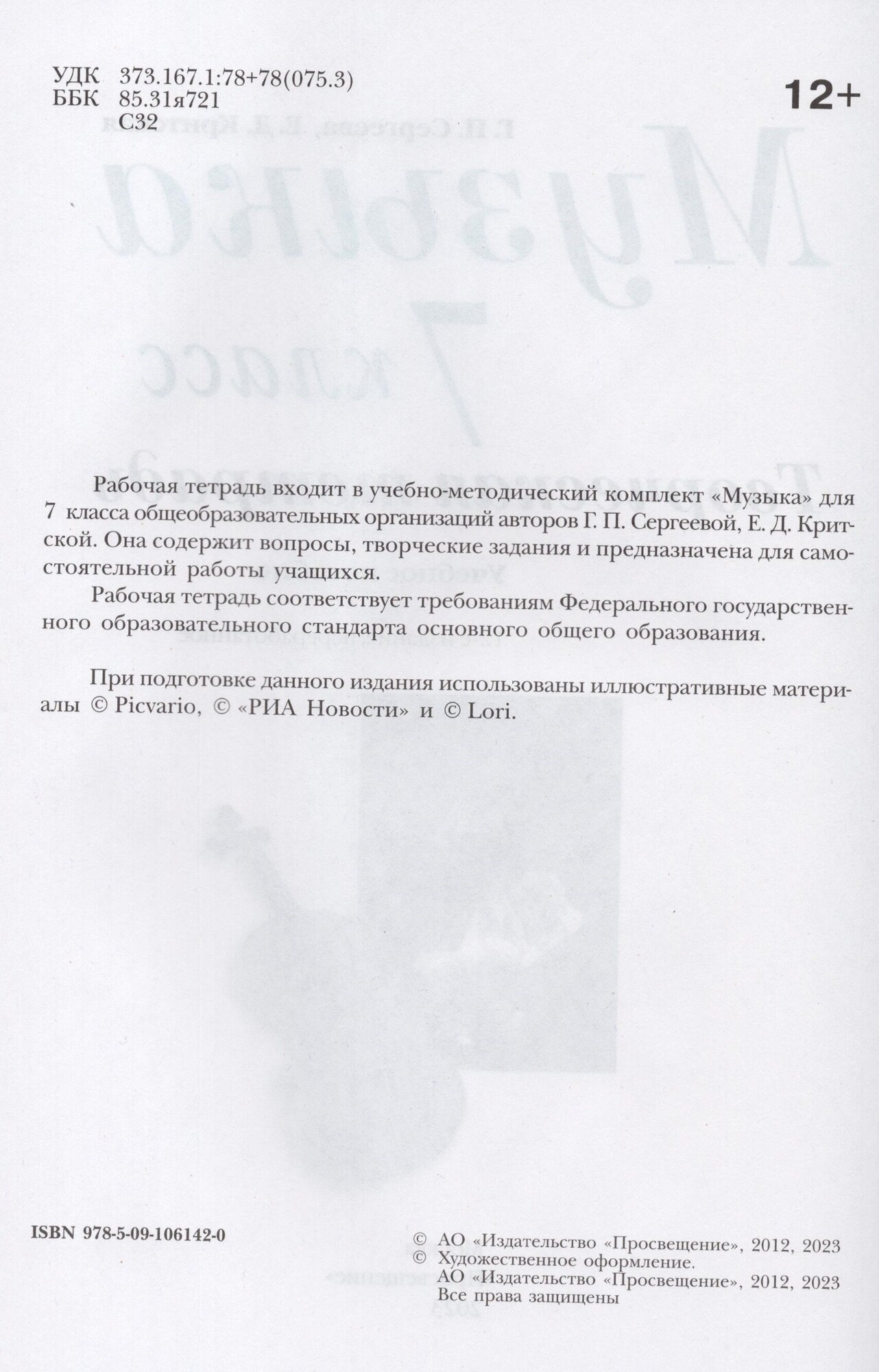 Рабочая тетрадь входит в учебно-методический комплект "Музыка" для 7 класса общеобразовательных организаций авторов Г. П. Сергеевой, Е. Д. Критской. Она содержит вопросы, творческие задания и предназначена для самостоятельной работы учащихся.