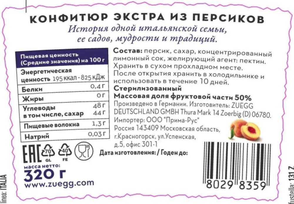 | Состав | персик, сахар, концентрированный лимонный сок, желерующий агент |