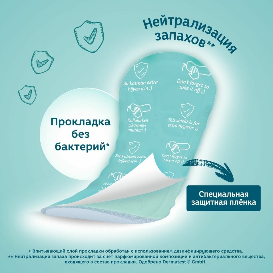 Женские гигиенические антибактериальные прокладки Antibakteriyel от турецкого бренда Molped подарят чувство свежести и комфорта, уберут неприятный запах и предотвратят рост бактерий. Каждая прокладка покрыта антибактериальным слоем, который закрыт защитной пленкой, обеспечивая 100% защиту от нежелательного контакта. Слой обеззаражен и продезинфицирован UV-C (ультрафиолет-С). Нормализуют ph-баланс слизистой и кожи наружных половых органов, снижают уровень бактерий, улучшают местное кровообращение, снимают отечность в области половых органов. Впитываемость - 6 капель. Длина прокладки - 31 см. Длина липкого слоя - 25 см. Ширина липкого слоя - 4,7 см. Ширина прокладки - 8 см. Ширина прокладки сзади - 10,5 см. Длина крылышек - 10,3 см. Ширина крылышек - 4 см. Вид индивидуальной упаковки - полиэтилен. Аромат/запах - ароматизированные (мята, лимон). Срок годности 3 года.