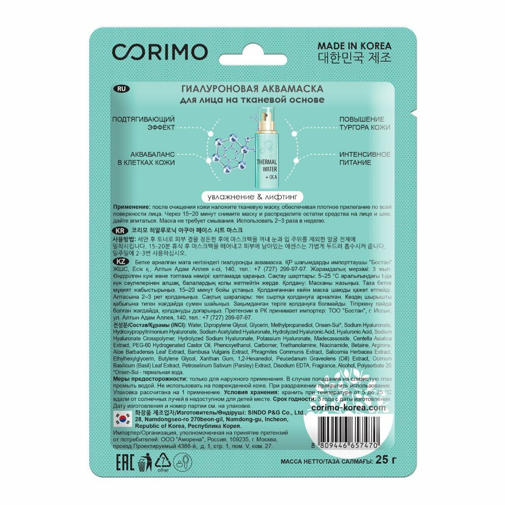 Аквамаска для лица Corimo Гиалуроновая 25г SINDO P&G Co., Ltd
