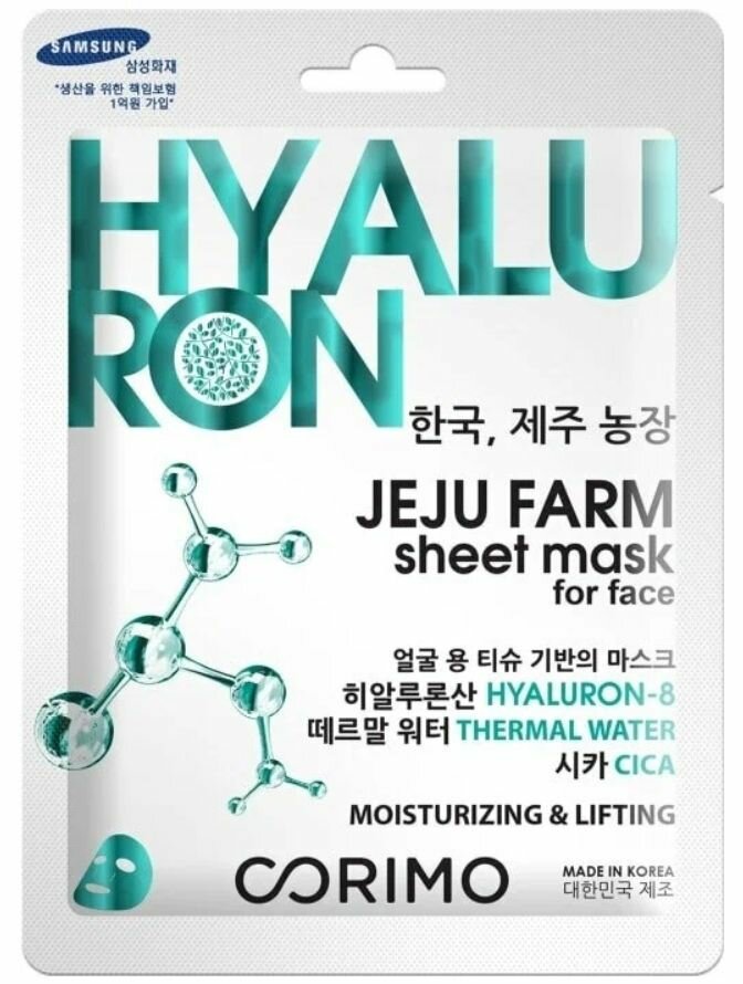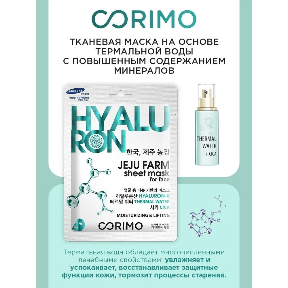 Тканевая аквамаска для лица Corimo обновляет и подтягивает кожу. Богата витаминами, полисахаридами и полезными минералами благодаря высокому содержанию активных компонентов: CICA-комплекс, аргинин, родниковая вода Onsen-Sui из горячих источников Японии. Комплекс из 8 видов гиалуроновой кислоты в составе средства помогает восстанавливать естественный водный баланс в клетках кожи. Улучшает цвет лица, увлажняет и тонизирует, кожа становится заметно более подтянутой и упругой.