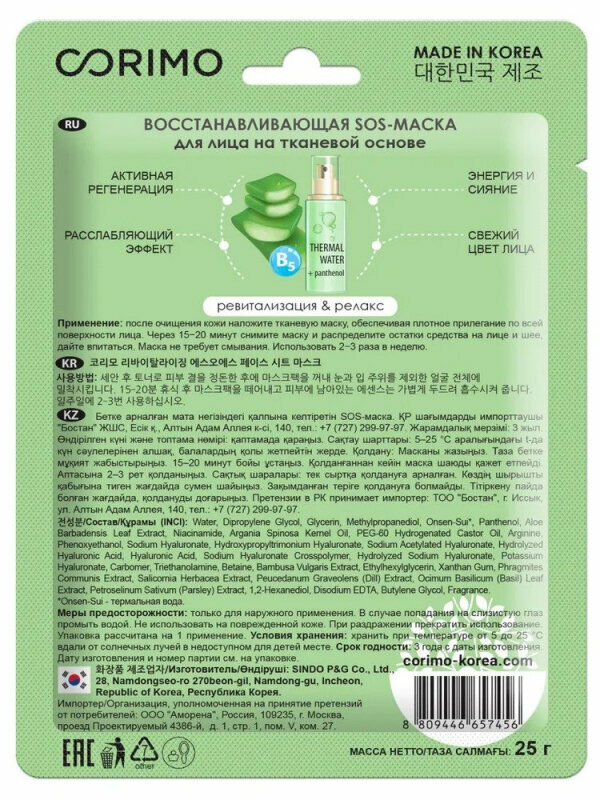 SOS-Маска для лица Corimo Восстанавливающая 25г SINDO P&G Co., Ltd