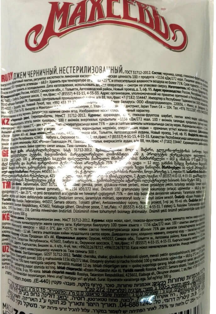 | Состав | черника, сахар, глюкозно-фруктозный сироп, вода, пектин, регулятор кислотности - кислота лимонная, консервант - кислота сорбиновая. |