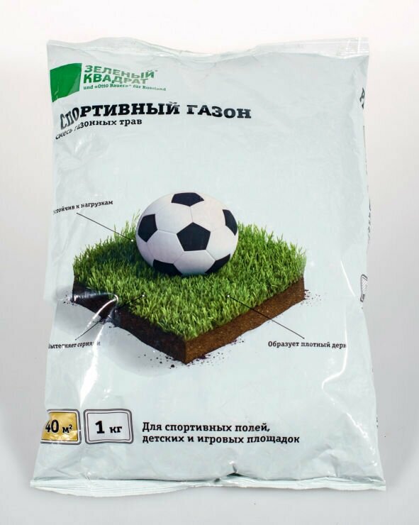 Смесь газонных трав Зеленый ковер 186570 1 кг - для спортивных полей, детских и игровых площадок. Газон устойчив к нагрузкам, вытесняет сорняки. Упаковка рассчитана на 40 кв. метров.