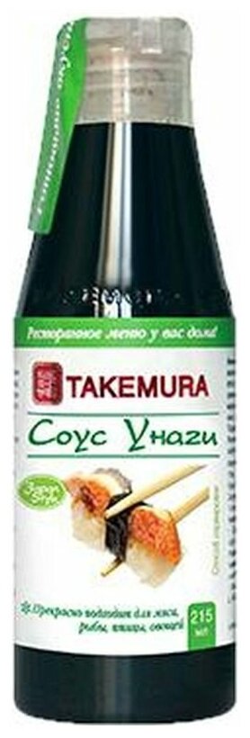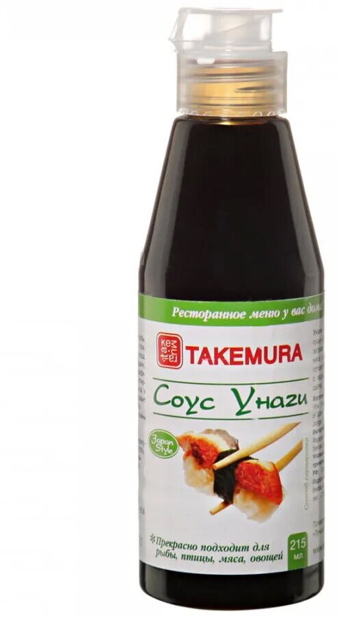 Унаги - классический японский универсальный густой соус. Идеально подходит к рыбным и овощным блюдам.Отличительные особенности Унаги TAKEMURA - густой тягучий соус с сладко-соевым ароматом с нотой копчения. Вкус классического унаги соуса с копченым послевкусием.Способ применения: Унаги TAKEMURA можно использовать как классический соус для рыбы, птицы, овощей, так и соус для приготовления суши и роллов, как соус для жарки на гриле (предварительно разбавьте его водой), добавлять как дрессинг (заправку) в салаты. Отлично сочетается с рисом!