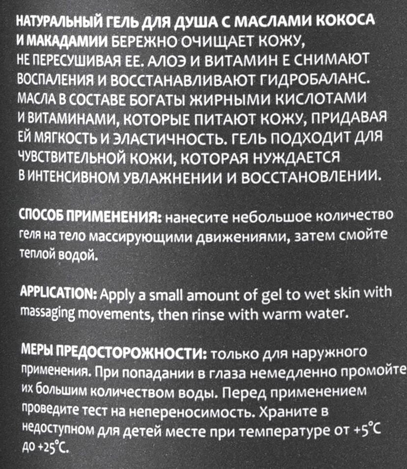 | Состав | aqua, cocamidopropyl betaine, sodium coco-sulfate, pentylene glycol, glycerin, sodium chloride, benzyl alcohol, aloe barbadensis leaf extract, tocopheryl acetate (vitamin Е), lactic acid, butyrospermum parkii (shea butter) oil, cocos nucifera (coconut) oil, macadamia ternifolia seed oil, parfum |