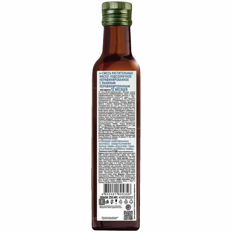 | Состав | Масло подсолнечное нерафинированное с добавлением льняного. |
