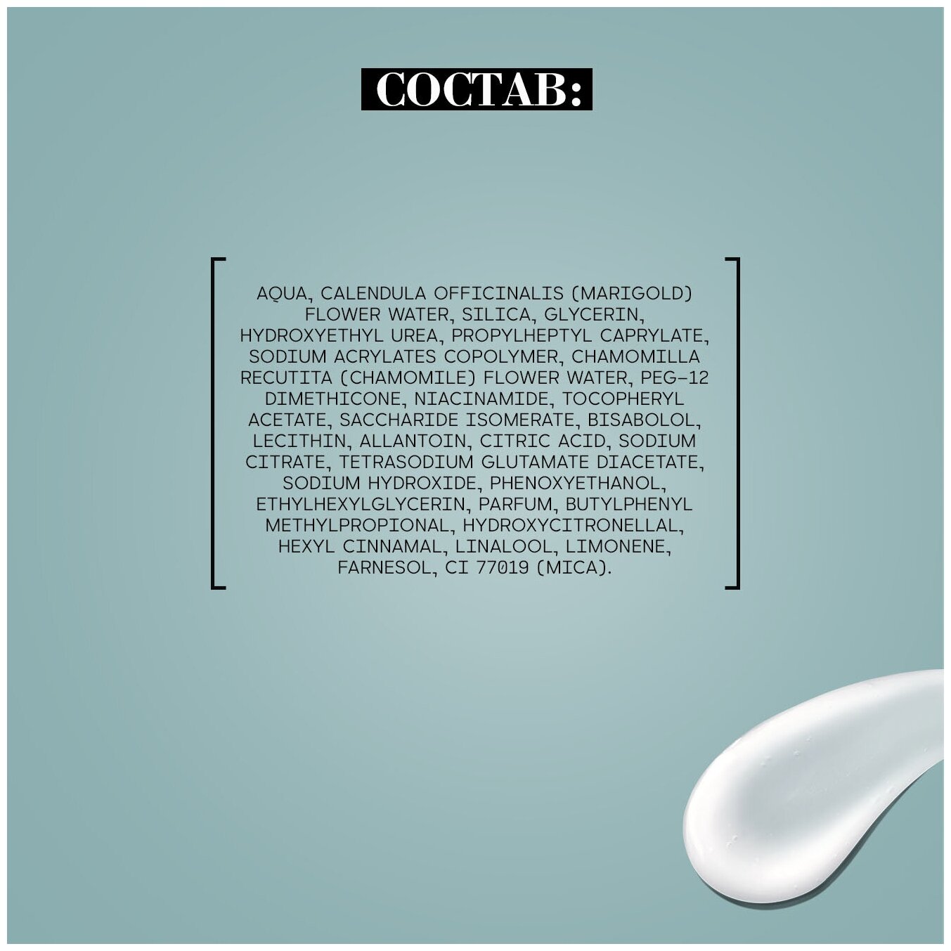 | Состав | aqua, marigold flower water, silica, glycerin, hydroxyethyl urea, propylheptyl caprylate, sodium acrylates copolymer, chamomile flower water, peg-12 dimethicone, niacinamide, tocopheryl acetate, saccharide isomerate, bisabolol, lecithin, allantoin, citric acid, sodium citrate, tetrasodium glutamate diacetate, sodium hydroxide, phenoxyethanol, ethylhexylglycerin, parfum, butylphenyl methylpropional, hydroxycitronellal, hexyl cinnamal, linalool, limonene, farnesol, ci 77019 (mica) |