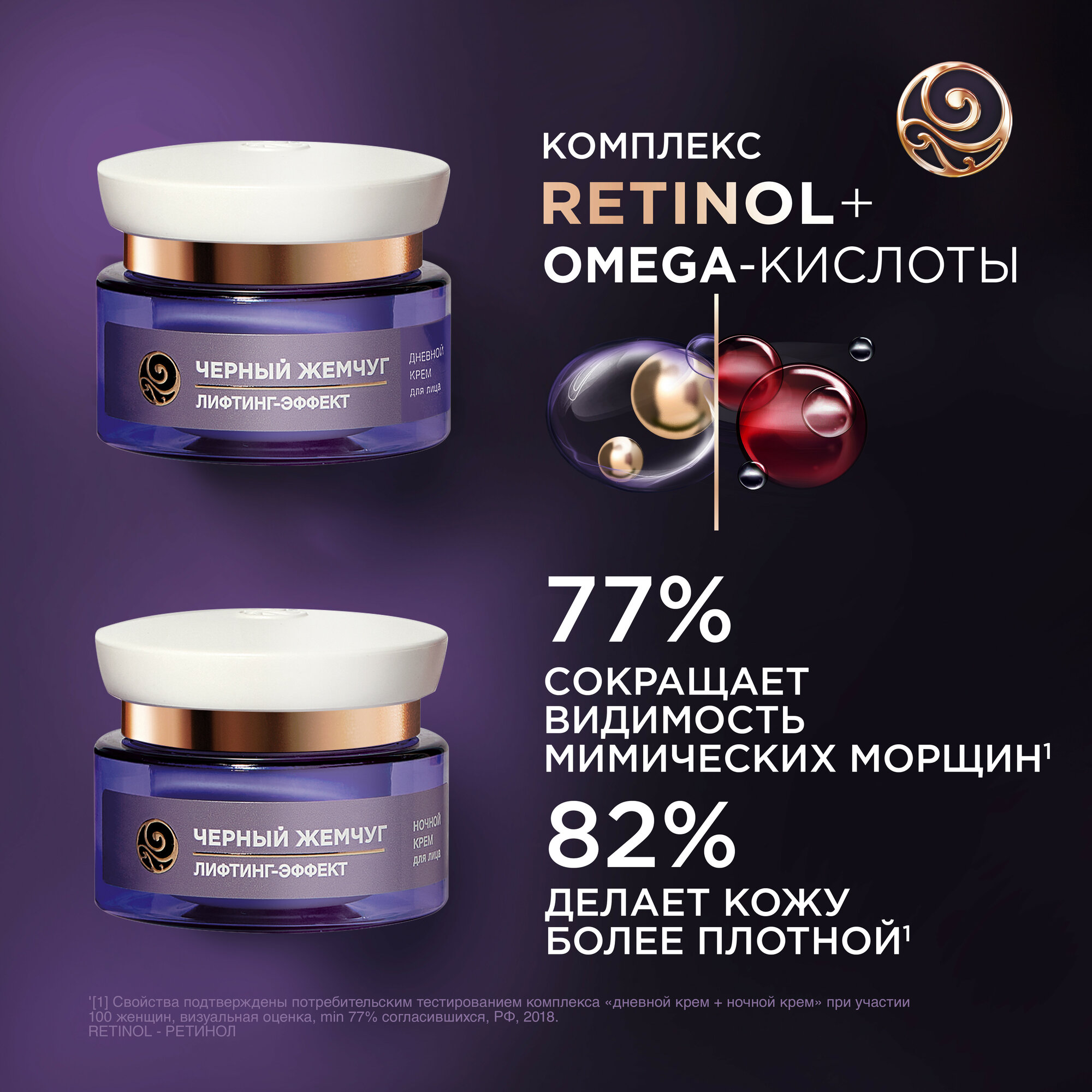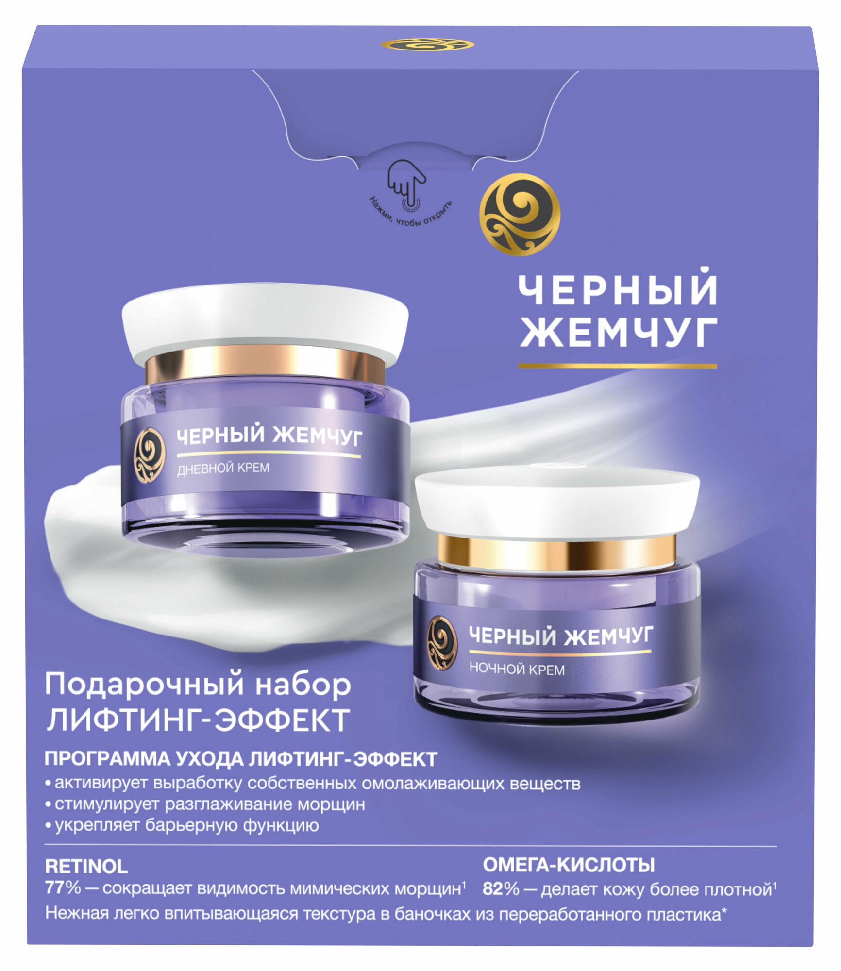 Дарите заботу о красоте вместе с подарочным набором Лифтинг-эффект от бренда Черный Жемчуг. В любом возрасте кожа имеет свои особенности, с учетом которых стоит подбирать уходовые средства. После 46-и кожа нуждается в специальном уходе, потому что становится более тонкой, закладываются глубокие морщины, снижается синтез естественных липидов эпидермиса, из-за чего кожа становится более сухой и быстрее теряет влагу. Необходима активизация собственных ресурсов, укрепление барьерной функции и восстановление плотности и упругости кожи. Эксперты бренда Черный Жемчуг разработали программу Лифтинг-эффект с учетом потребностей кожи 46+ и с использованием современных технологий. Подарочный набор включает в себя два продукта: ночной и дневной крем Лифтинг-эффект. Всего два простых и необходимых шага для восстановления и укрепления кожи.Ночной крем для лица обеспечивает лифтинг-эффект, уплотняет и омолаживает кожу. Специально подобранная концентрация ретинола ускоряет синтез межклеточных липидов и коллагена и эффективно борется с морщинами. Крем глубоко* питает и увлажняет кожу, способствует восстановлению четкости контуров.Дневной крем выравнивает микрорельеф кожи, подготавливая ее к нанесению макияжа. Липосомальная форма ретинола эффективно доставляет активный компонент к клеткам кожи. Дневной уход с ретинолом поддерживает плотность, упругость и эластичность и улучшает барьерную функцию. Омега-кислоты в составе гаммы кремов усиливают барьерную функцию, питают и повышают тонус кожи, улучшают ее текстуру и влагоудерживающую способность. Откройте свой возраст возможностей!* в пределах эпидермиса.